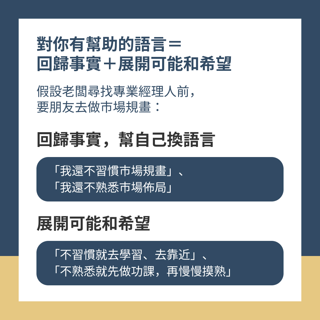 假設朋友的老闆,在尋找專業經理人取代他前,要他去做市場規畫,他可以先還原事實,幫自己換句話說:「我還不習慣市場規畫」、「我還不熟悉市場佈局」;接下來展開可能和希望,對自己說:「不習慣就去學習、去靠近」、「不熟悉就先做功課,再慢慢摸熟。」他就能開始有動力,往更好的方向前進。
