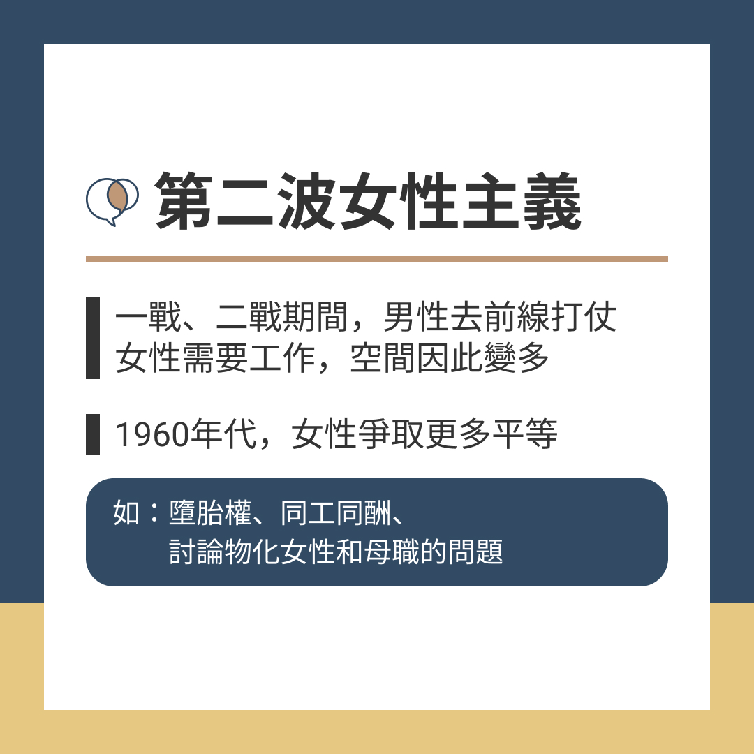1960年代,女性爭取更多平等,如:墮胎權、同工同酬、討論物化女性和母職的問題