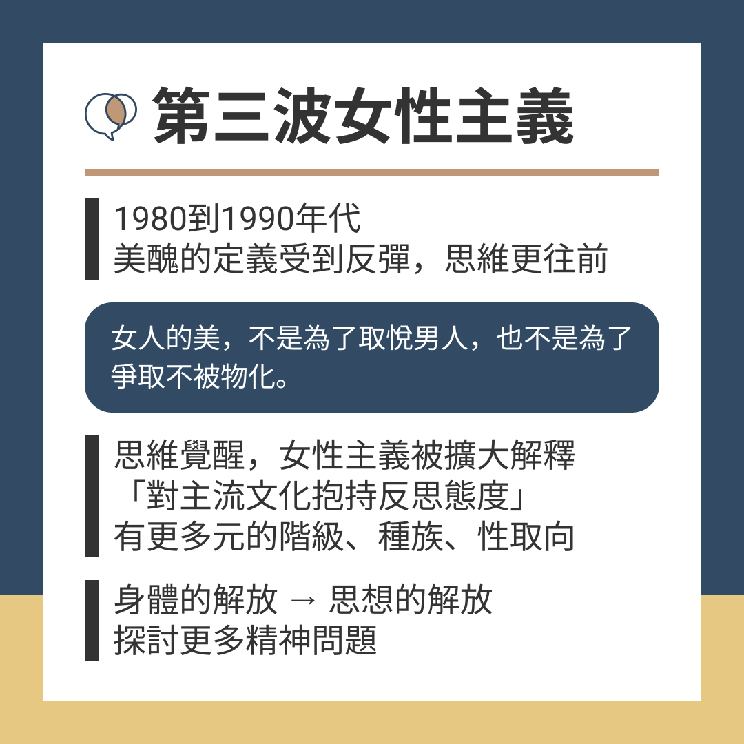 1980到1990年代,美醜的定義受到反彈(為了平等,女性要變得像男性一樣嗎?),思維因而更往前:女人的美,不是為了取悅男人,也不是為了爭取不被物化