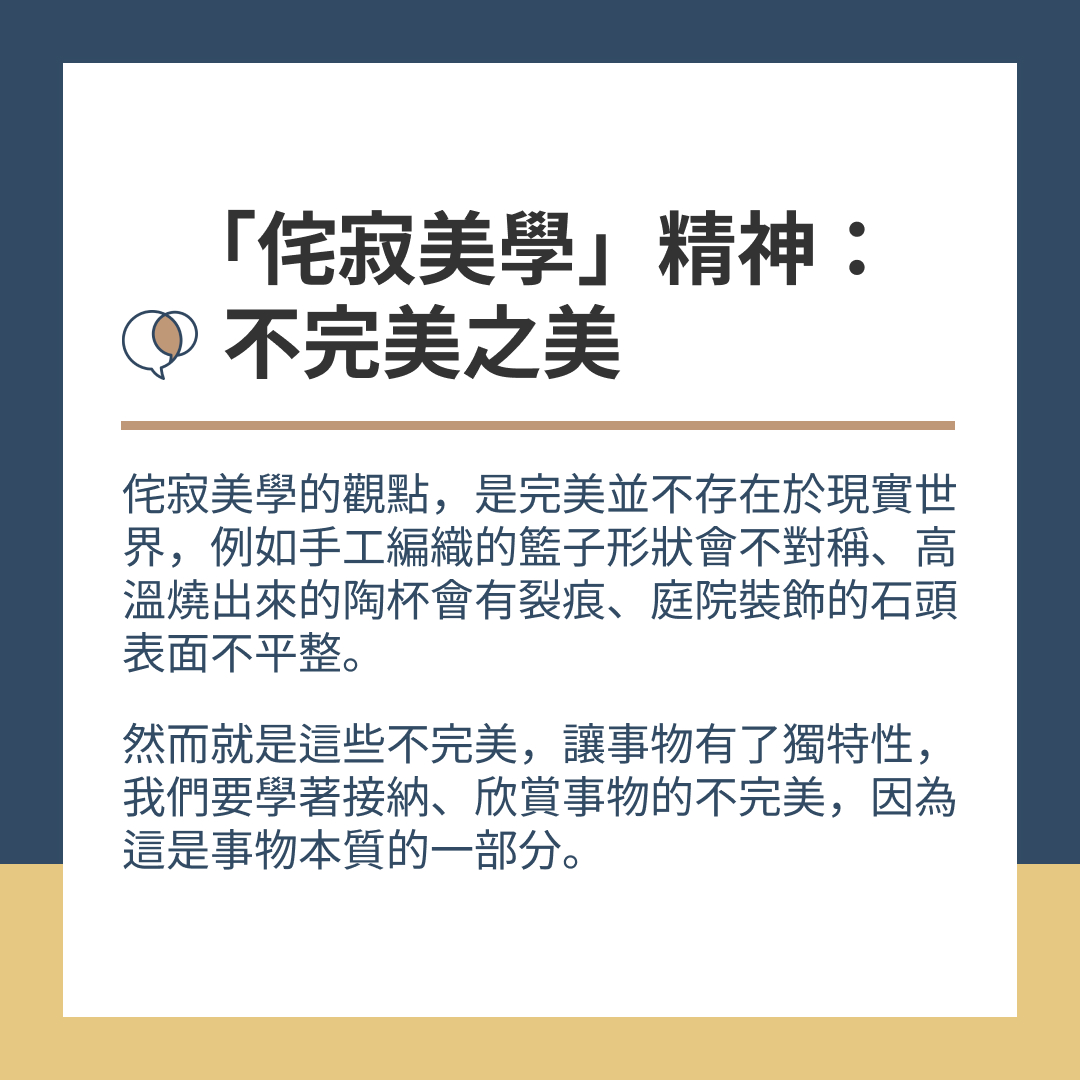 侘寂美學的觀點,是完美並不存在於現實世界,例如手工編織的籃子形狀會不對稱、高溫燒出來的陶杯會有裂痕、庭院裝飾的石頭表面不平整,然而就是這些不完美,讓事物有了獨特性,因此我們要學著接納、欣賞事物的不完美,因為這是事物本質的一部分。