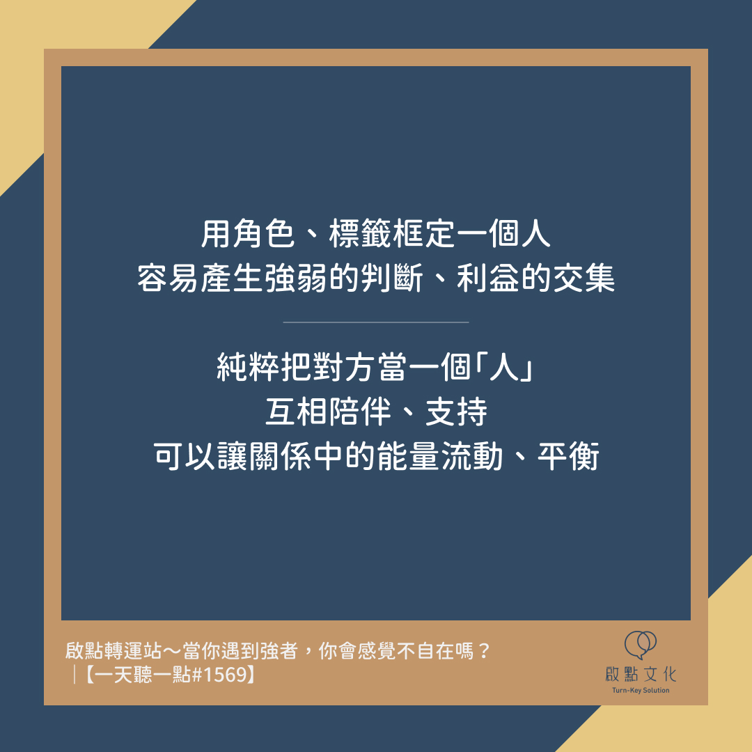 用角色、標籤框定一個人,容易產生強弱的判斷、利益的交集;純粹把對方當一個「人」,互相陪伴、支持,則可以讓關係中的能量流動、平衡。