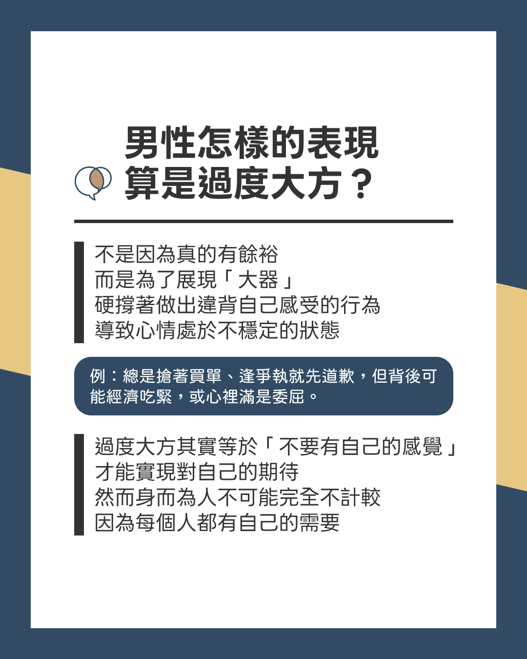 過度大方其實等於是「不要有自己的感覺」,才能實現對自己的期待。但身而為人不可能完全不計較,因為每個人都有自己的需要