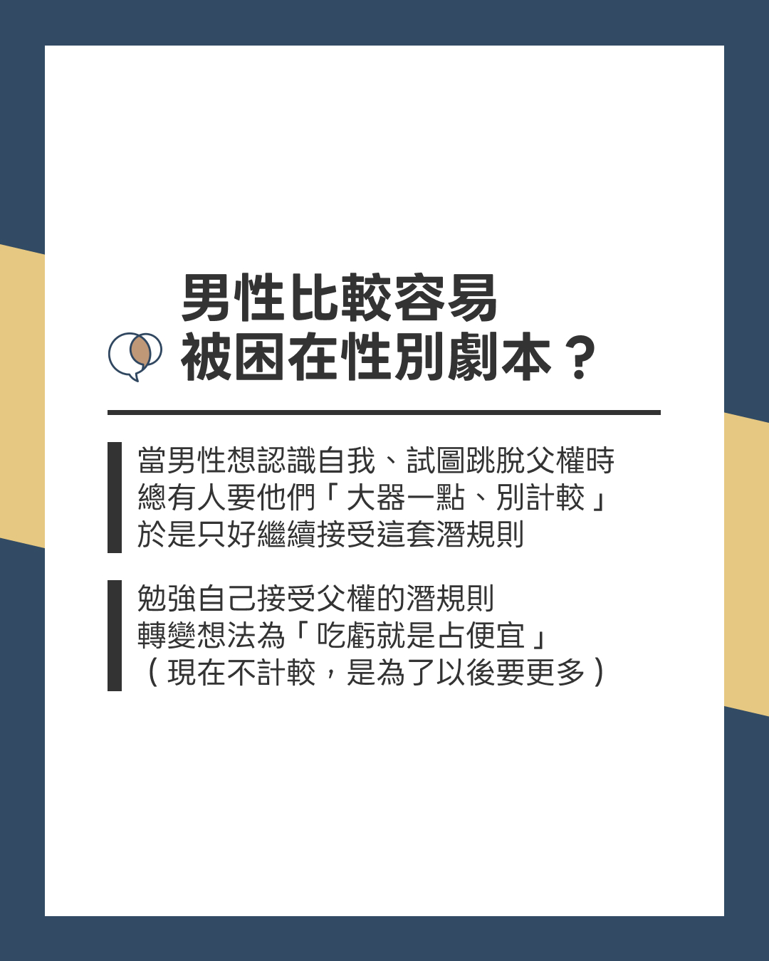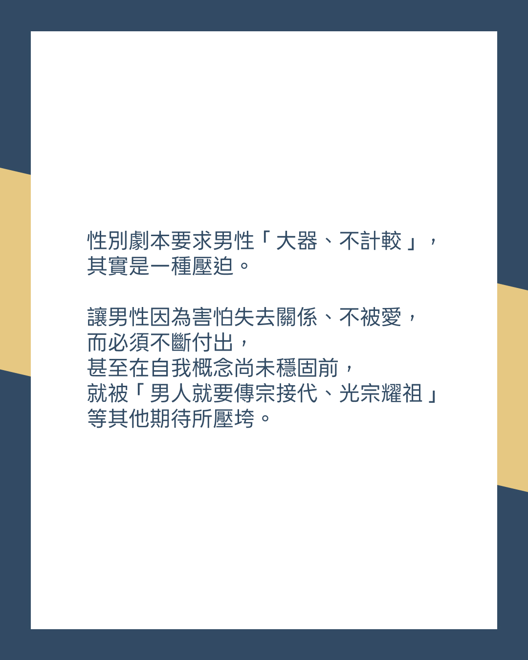 → 性別劇本要求男性「大器、不計較」,其實是一種壓迫。讓他們因為害怕失去關係、不被愛,而必須不斷付出,甚至在自我概念尚未穩固前,就被「男人就要傳宗接代、光宗耀祖」等期待壓垮。