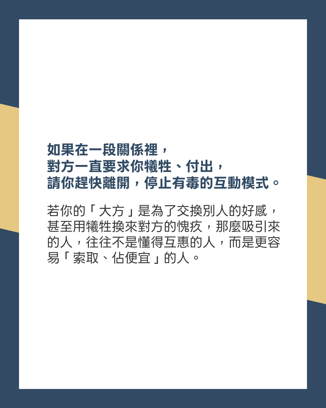 → 若你的「大方」是為了交換別人的好感,甚至用犧牲換來對方的愧疚,那麼吸引來的人,往往不是懂得互惠的人,而是更容易「索取、佔便宜」的人。