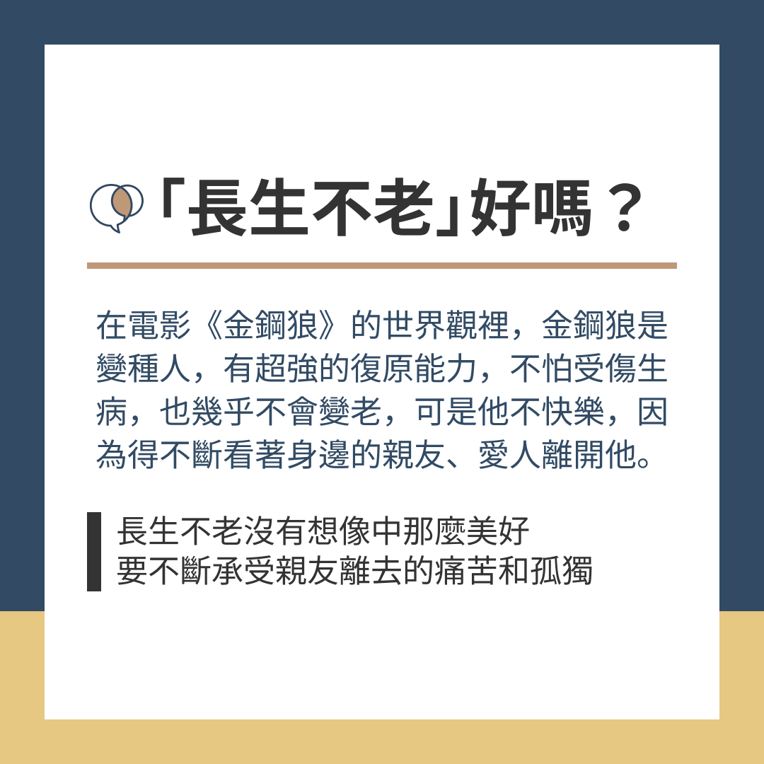 在電影《金鋼狼》的世界觀裡,金鋼狼是變種人,有超強的復原能力,不怕受傷生病,也幾乎不會變老,可是他並不快樂,甚至多次尋死,因為他得不斷看著身邊的親友、愛人離開他。