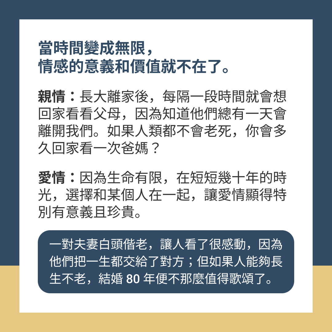 如果所有人都長生不老,親情、愛情、友情都會變得毫無意義,因為這些情感的價值,都建立在「我們都會死」、「時間是有限的」。