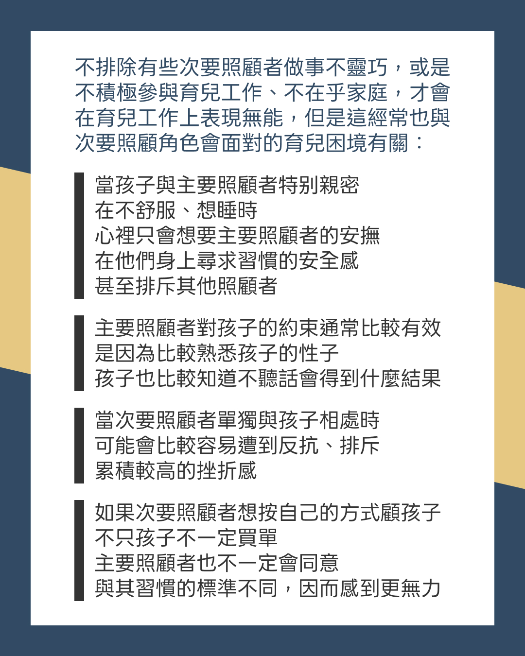 此外,如果次要照顧者想按自己的方式照顧孩子,不只孩子不一定買單,主要照顧者也不一定會同意(與其習慣的標準不同),因而感到更無力