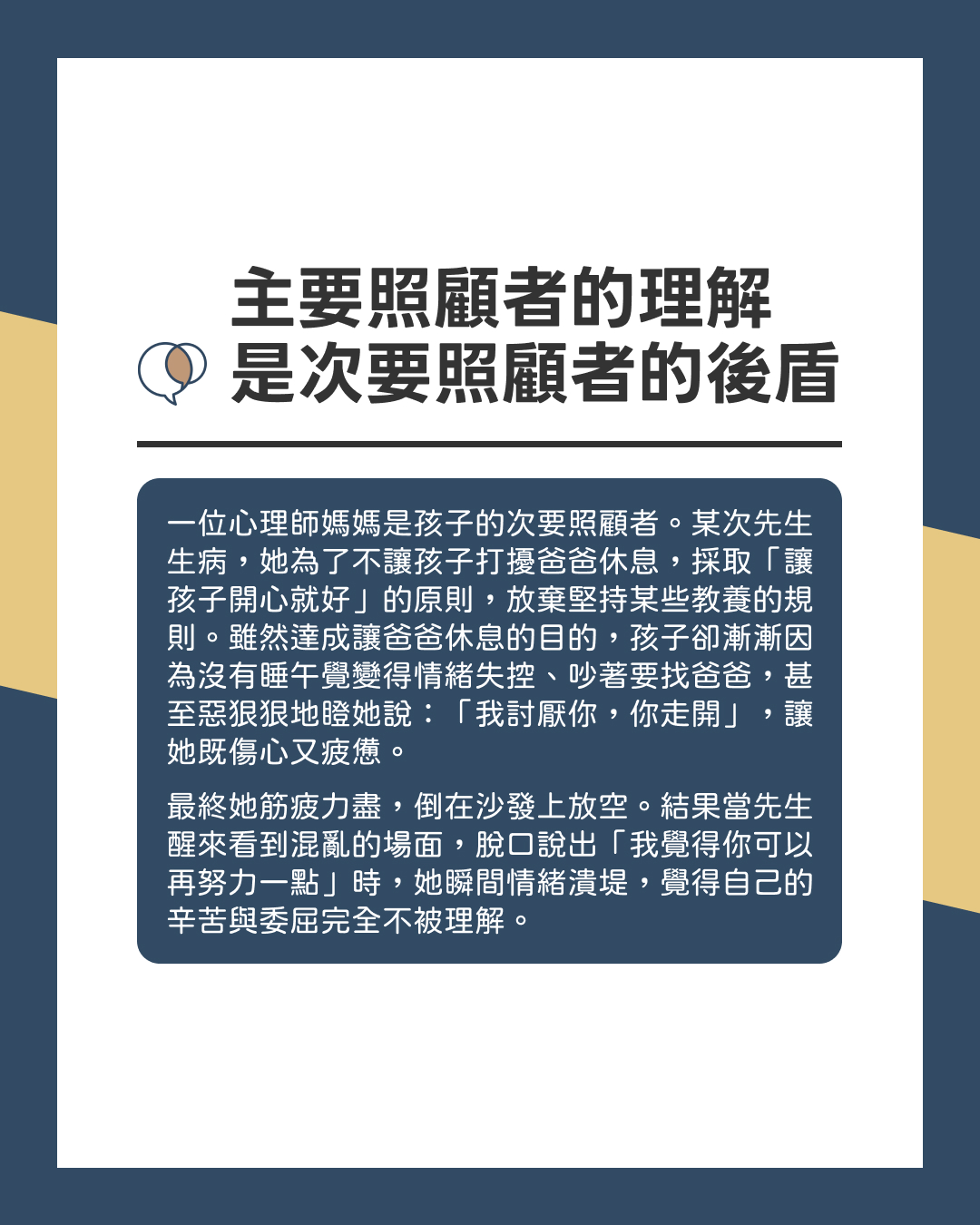 一位心理師媽媽是孩子的次要照顧者。某次先生生病時,她為了不讓孩子打擾爸爸休息,採取「讓孩子開心就好」的原則,放棄堅持某些教養規則。雖然達成讓爸爸休息的目的,孩子卻漸漸因為沒有睡午覺,而變得情緒失控、吵著要找爸爸,甚至惡狠狠地瞪她說:「我討厭你,你走開」,讓她既傷心又疲憊。