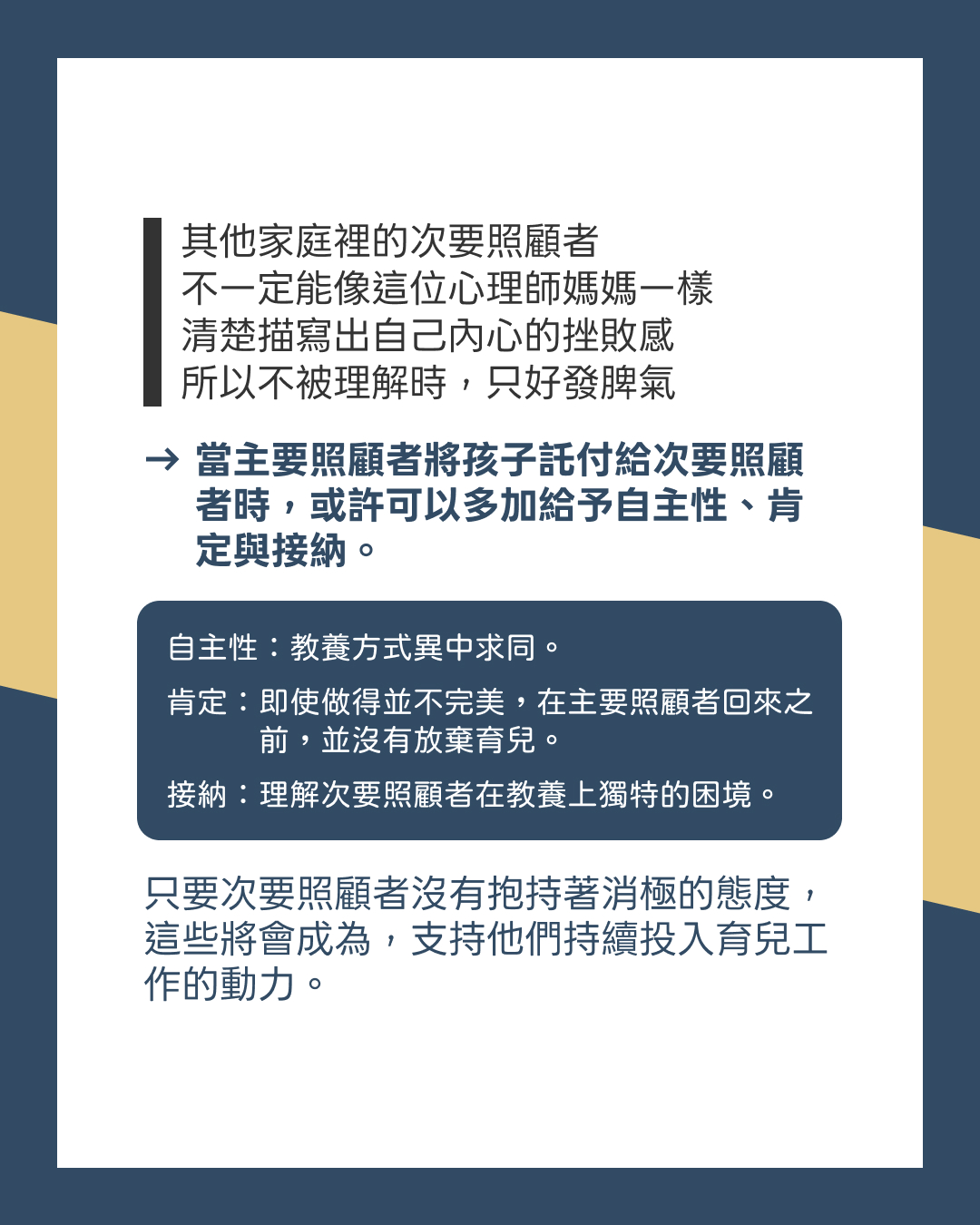 → 當主要照顧者將孩子託付給次要照顧者時,或許可以多加給予:「自主性」(教養方式異中求同)、「肯定」(即使做得並不完美,在主要照顧者回來之前,並沒有放棄育兒)與「接納」(理解次要照顧者在教養上獨特的困境)。只要次要照顧者沒有抱持著消極的態度,這些會成為支持他們持續投入育兒工作的動力。