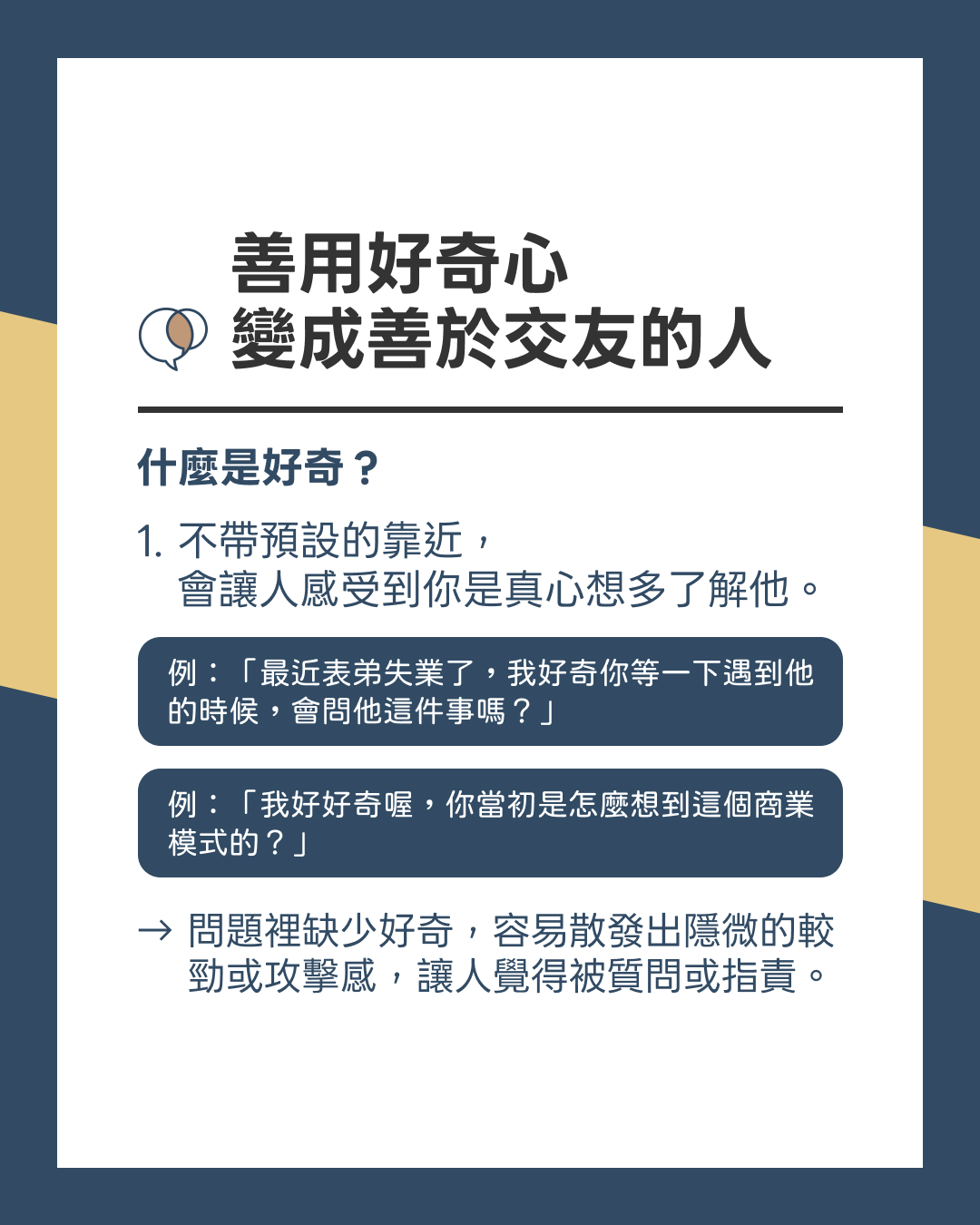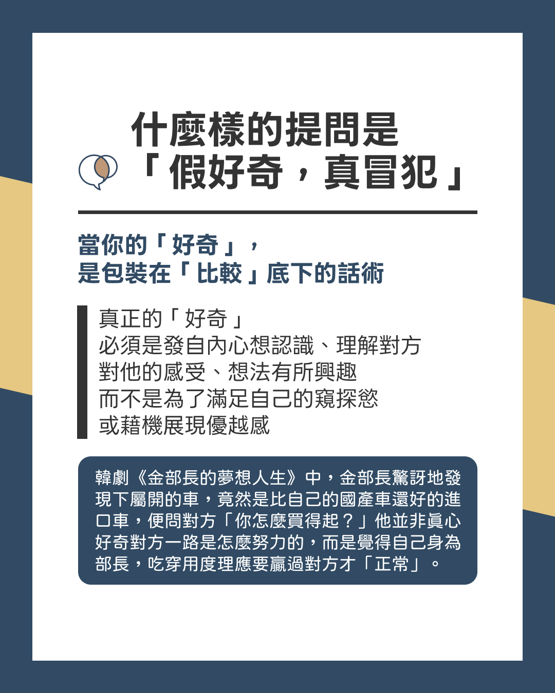 → 如果問題裡面缺少好奇,容易散發出隱微的較勁或攻擊感,讓人覺得被質問或指責。