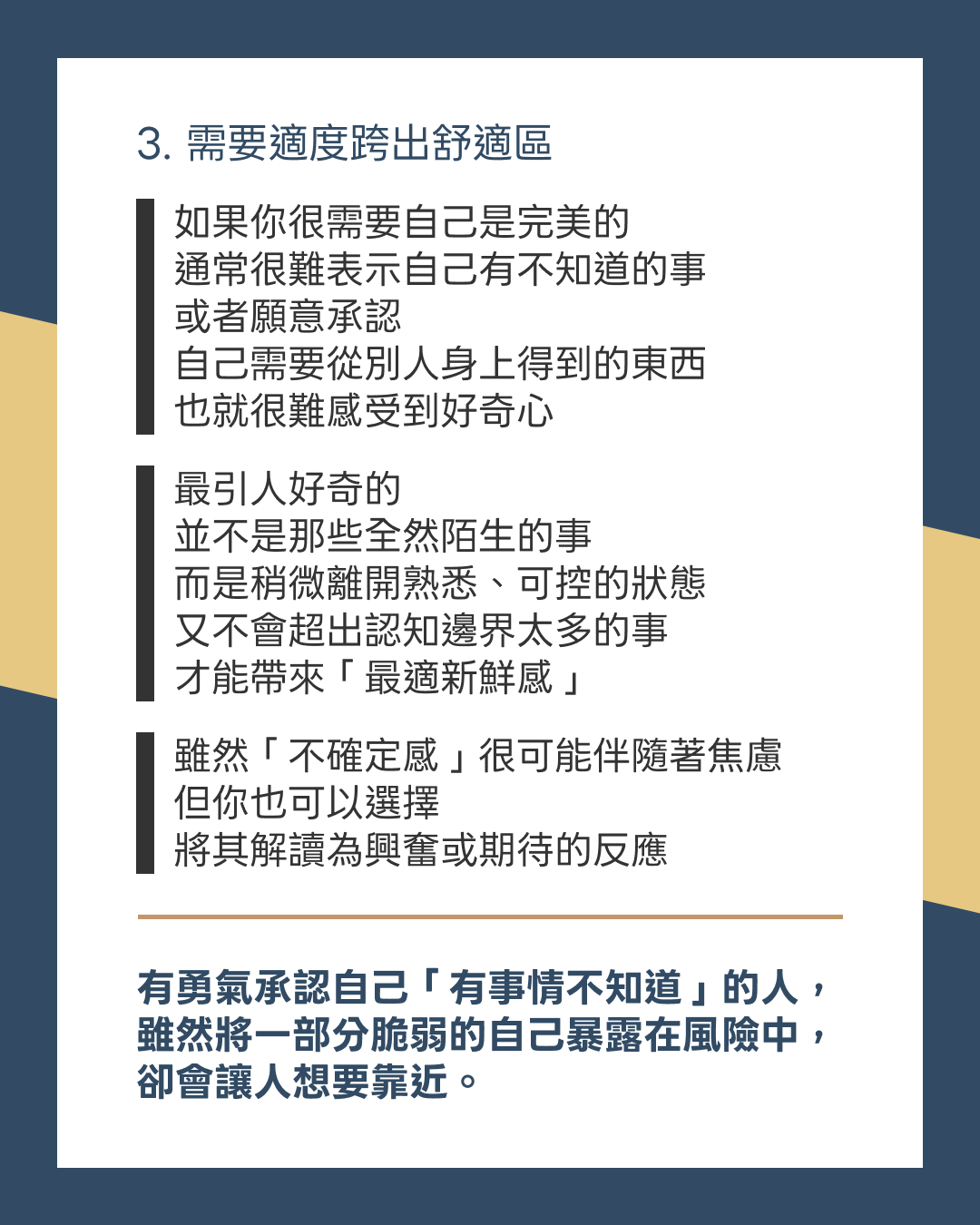 如果你很需要自己是完美的,通常很難表示自己有不知道的事,或願意承認自己需要從別人身上得到的東西,也就很難感受到好奇心