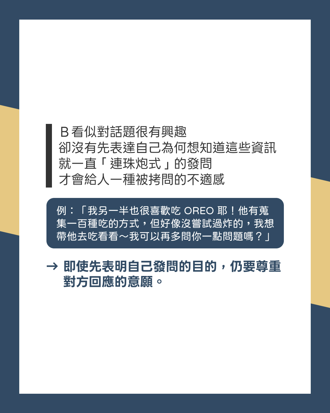 B看似對話題很有興趣,卻沒有先表達自己為何想知道這些資訊,就一直「連珠炮式」的發問,才會給人一種被拷問的不適感