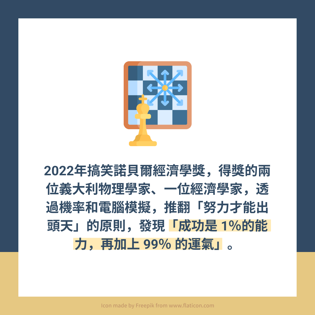 2022年搞笑諾貝爾經濟學獎,得獎的兩位義大利物理學家、一位經濟學家,透過機率和電腦模擬,推翻「努力才能出頭天」的人生原則,發現「成功是1%的能力,再加上99%的運氣」。