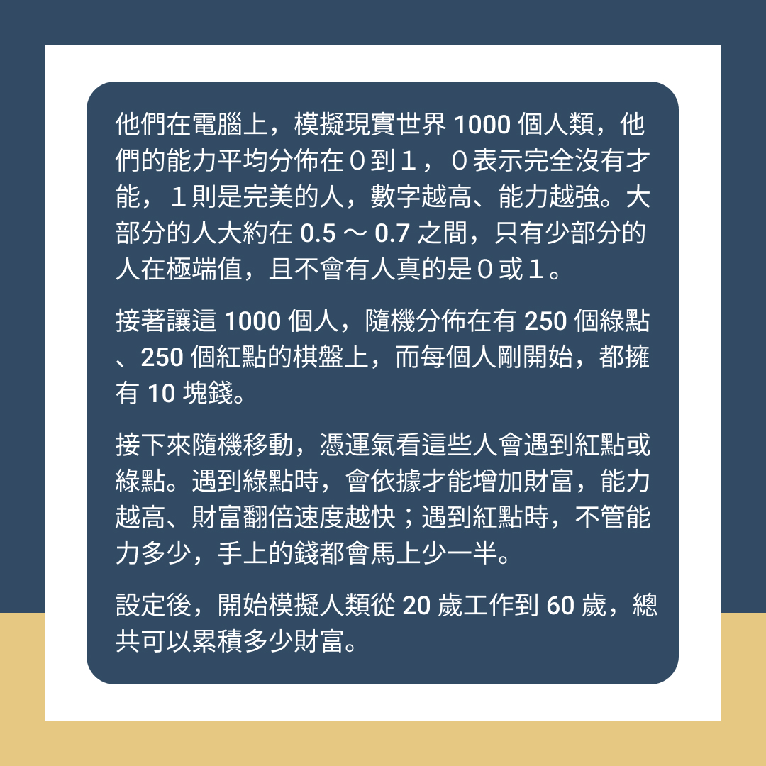 他們在電腦上,模擬現實世界1000個人類,他們的能力平均分佈在0到1,0表示完全沒有才能,1則是完美的人,數字越高、能力越強。大部分的人大約在0.5~0.7之間,只有少部分的人在極端值,且不會有人真的是0或1。接著讓這一千個人,隨機分佈在有250個綠點、250個紅點的棋盤上,而每個人剛開始都擁有10塊錢。