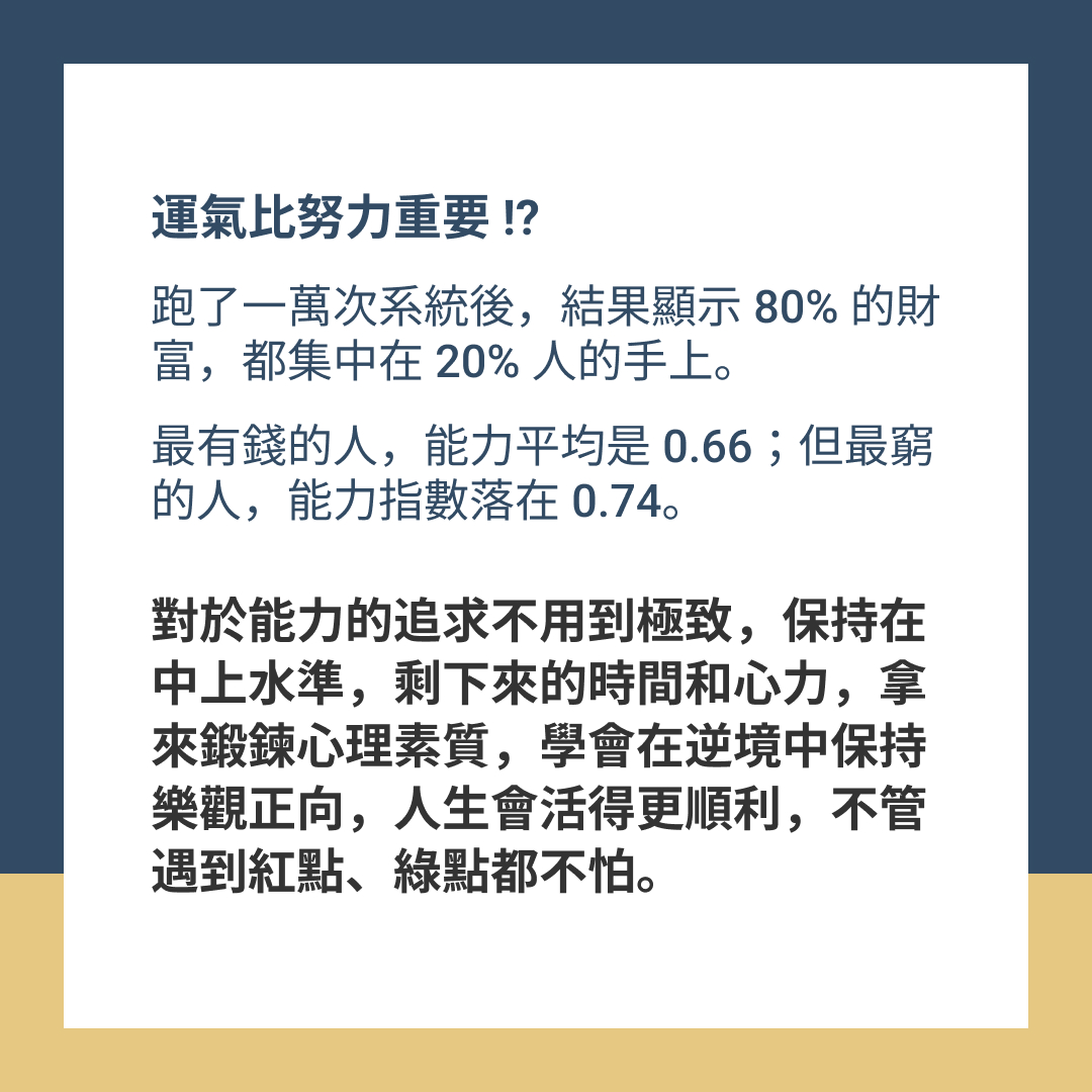 對於能力的追求不用到極致,保持在中上的水準,剩下來的時間和心力,拿來鍛鍊心理素質,學會在逆境中保持樂觀正向,人生會活得更順利,不管遇到紅點、綠點都不怕。
