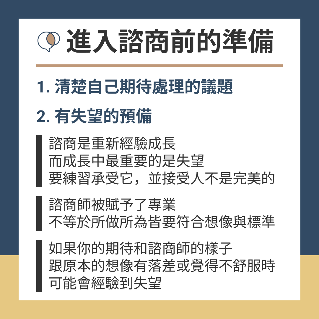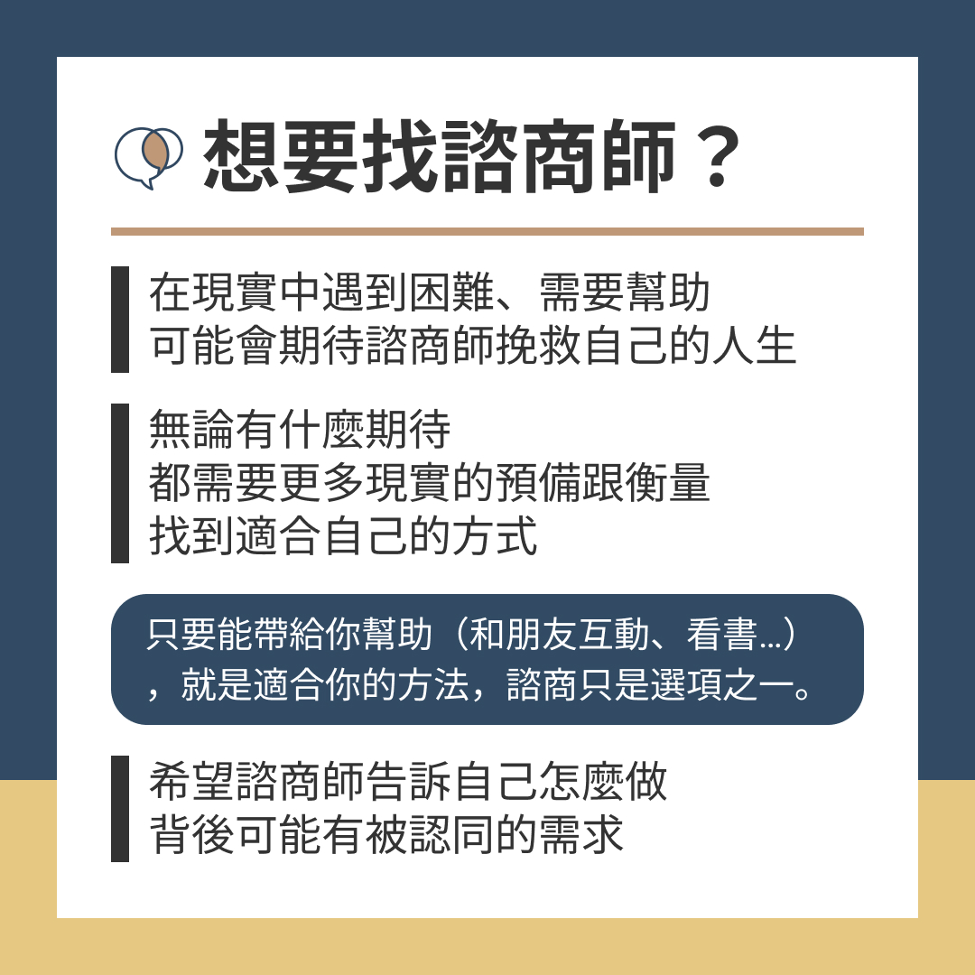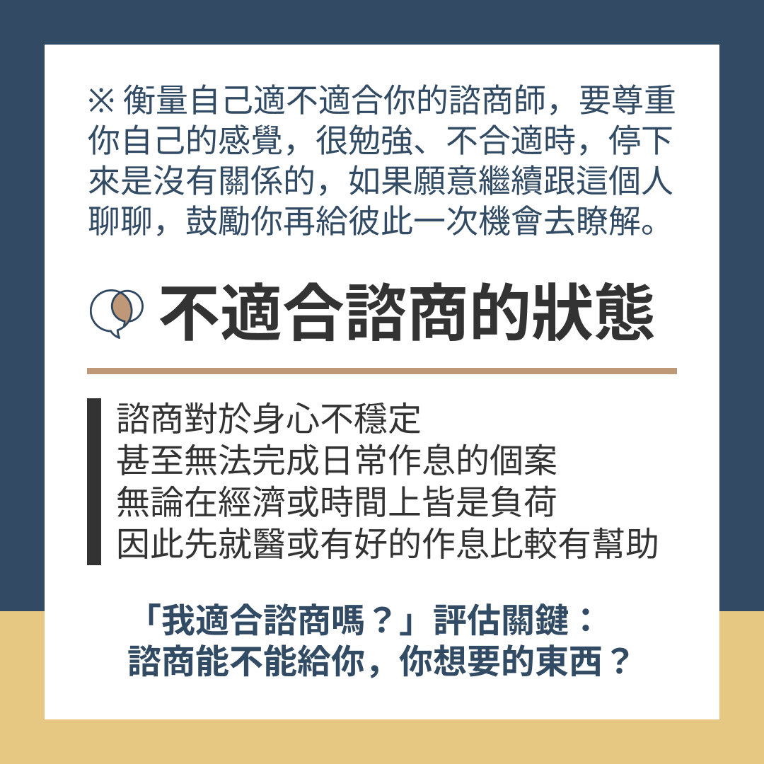 ※ 衡量自己適不適合這位諮商師,要尊重你自己的感覺,很勉強、不合適的時候,停下來是沒有關係的,如果願意繼續跟這個人聊聊,鼓勵你再給彼此一次機會瞭解