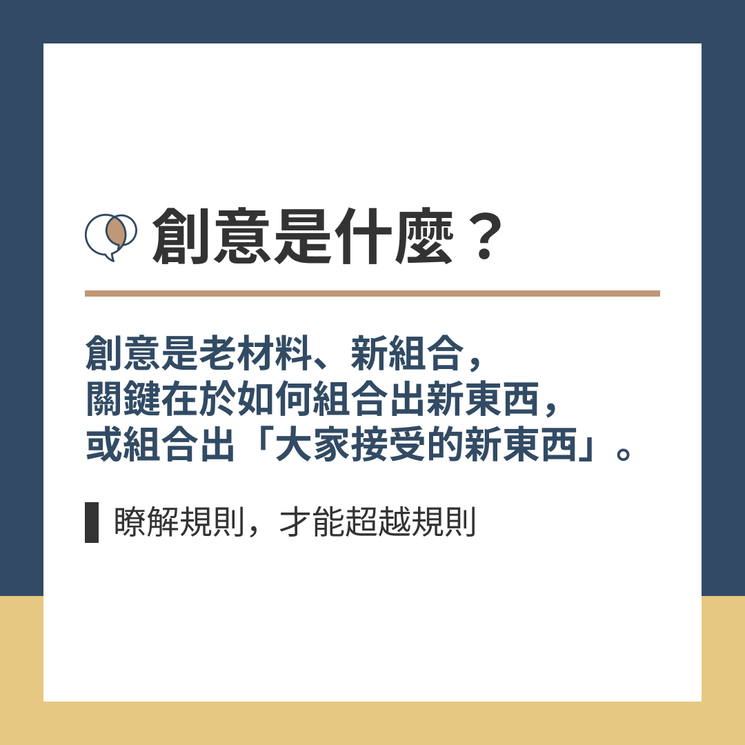 創意是老材料、新組合,關鍵在於如何組合出新東西,或組合出「大家接受的新東西」。