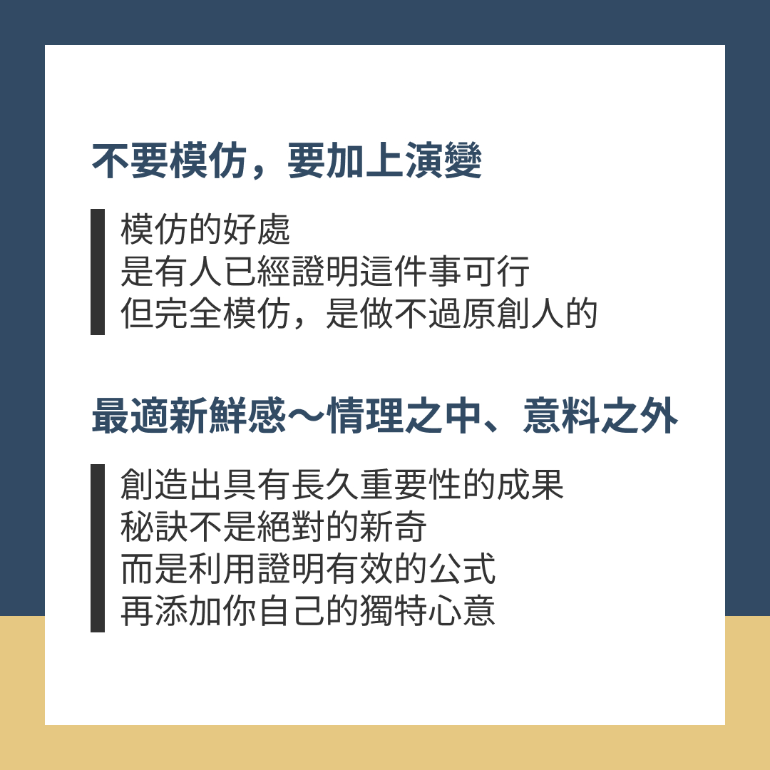 「創造出具有長久重要性的成果,秘訣不是絕對的新奇,而是利用證明有效的公式,再添加你自己的獨特心意。」