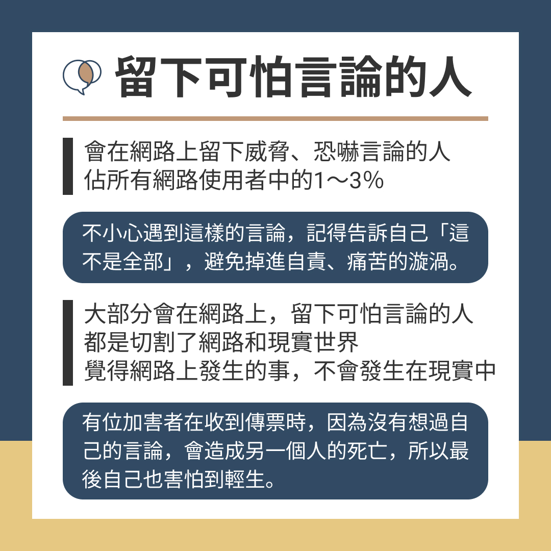 - 會在網路上留下威脅、恐嚇言論的人,佔所有網路使用者中的1~3%,雖然是少數,但破壞力十足,如果有一天不小心遇到這樣的言論,記得告訴自己「這不是全部」,避免掉進自責、痛苦的漩渦