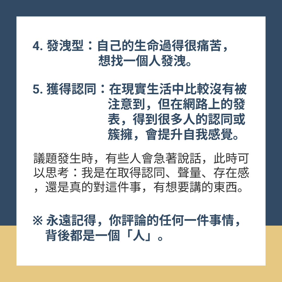 - 議題發生時,有些人會急著出來說話,此時可以思考:我是在取得認同、聲量、存在感,還是真的對這件事情,有想要講的東西