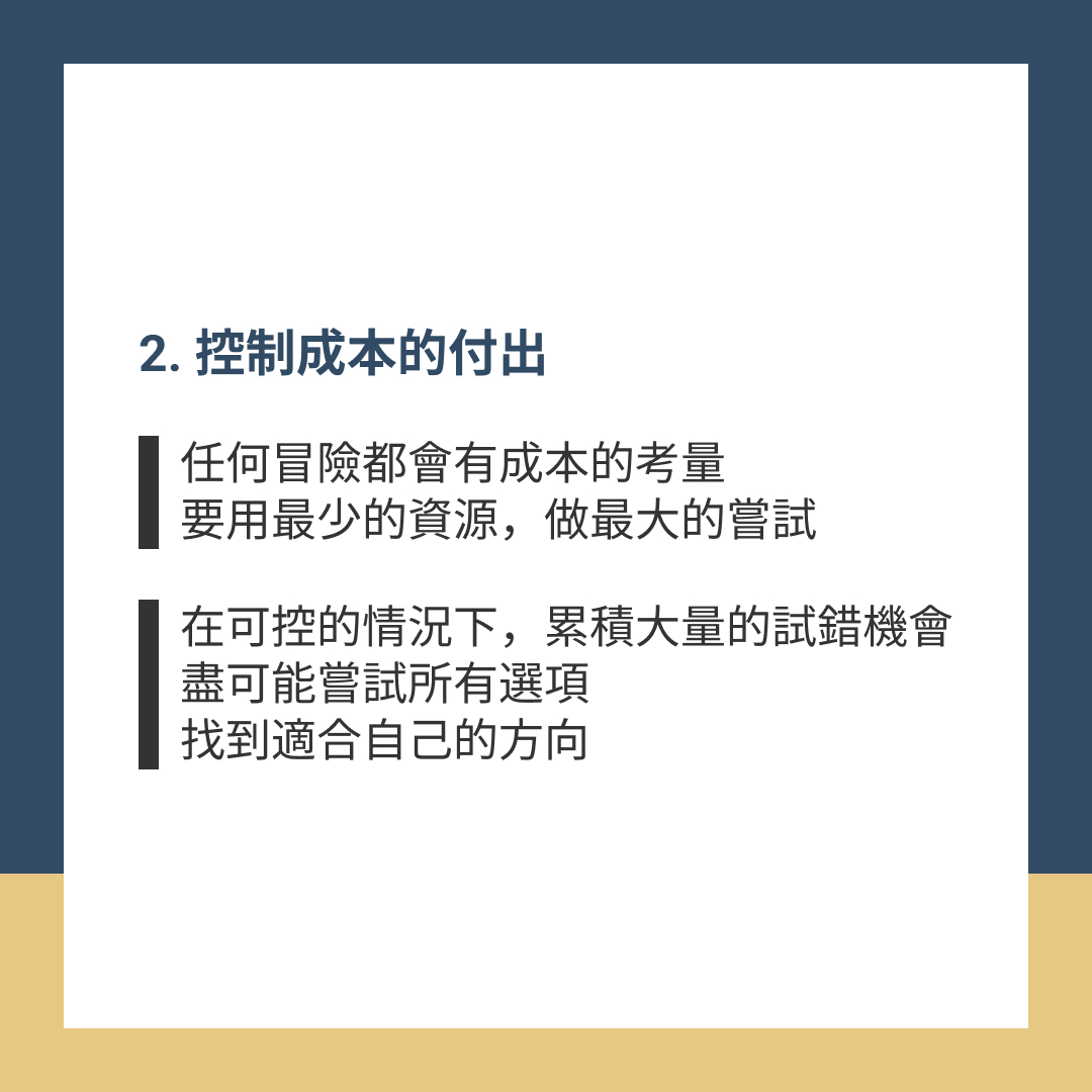 任何冒險都會有成本的考量,要用最少的資源,做最大的嘗試