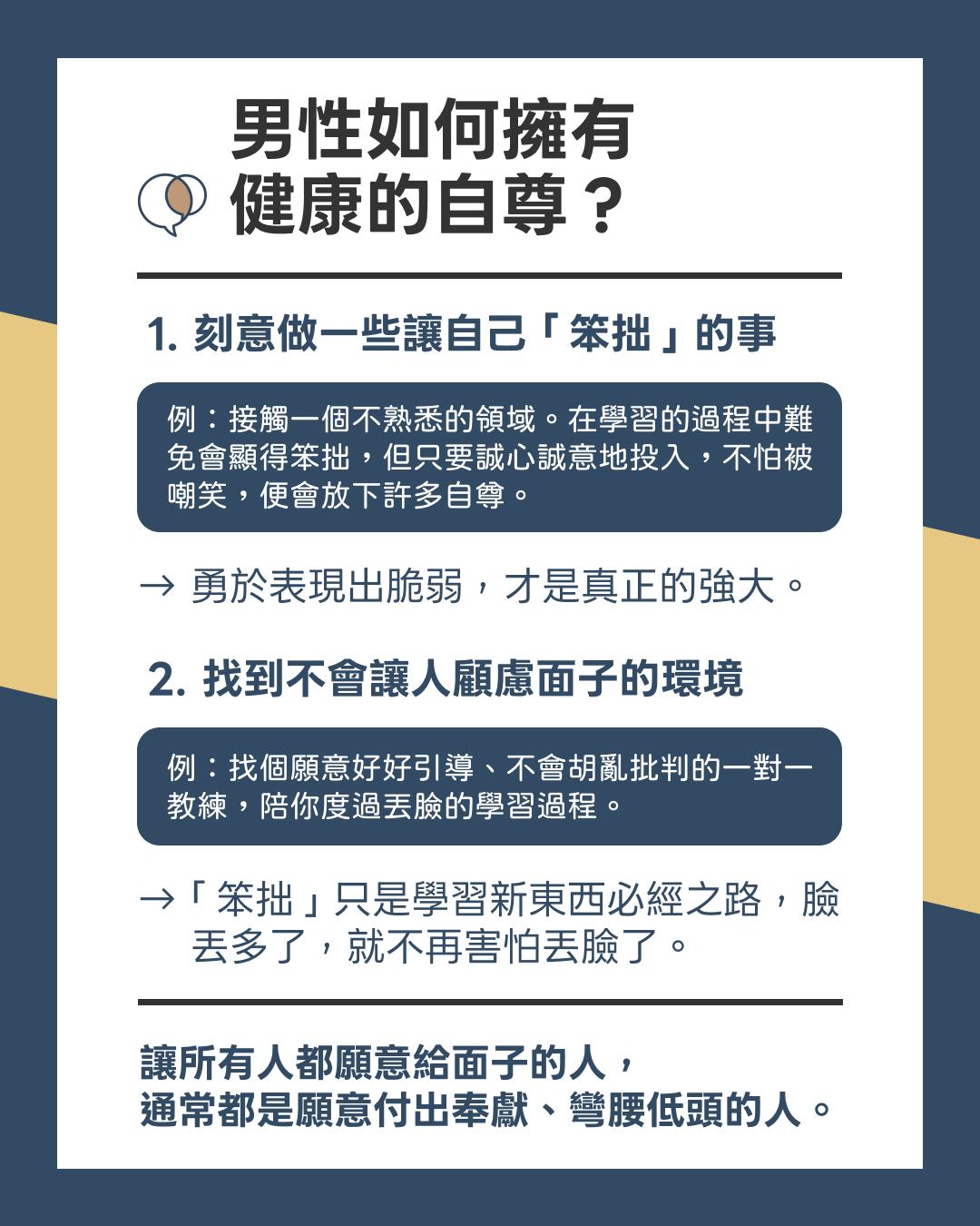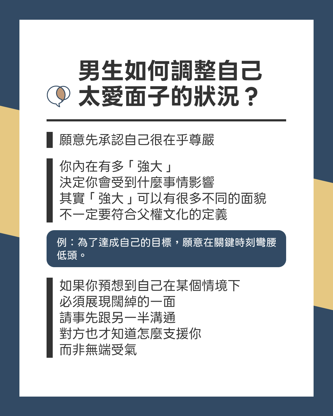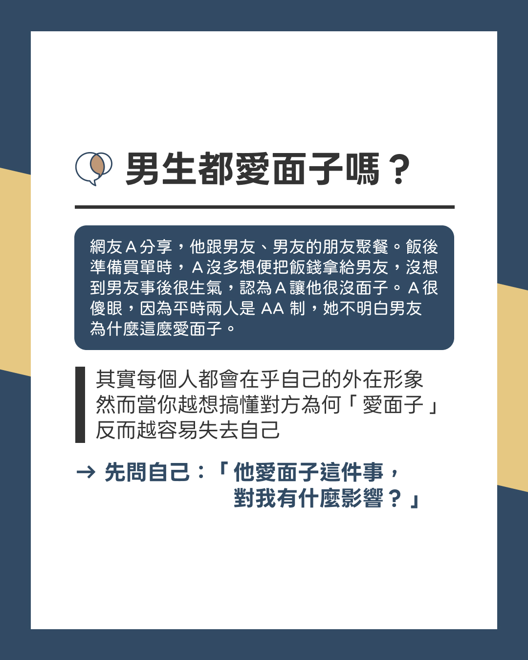 無須執著男生「為何很愛面子」這件事,先把力量收回自己身上,想想自己有哪些時刻也很在乎顏面、自己的面子建立在什麼事情上?