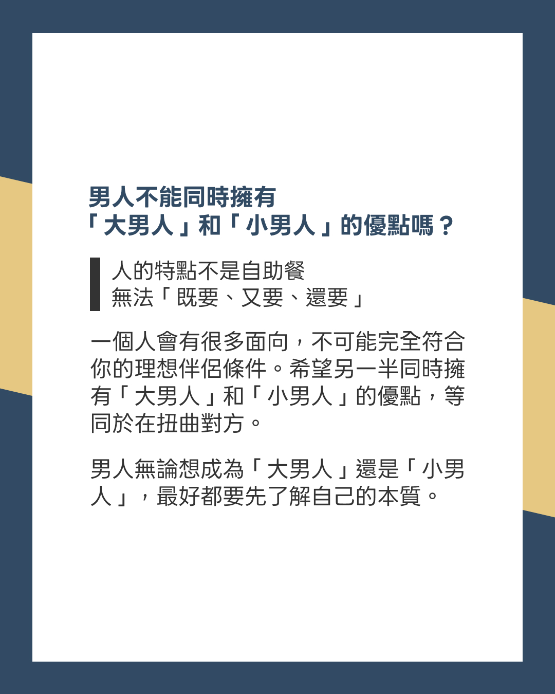 一個人會有很多面向,不可能完全符合你的理想伴侶條件。希望另一半同時擁有「大男人」和「小男人」的優點,等同於在扭曲對方