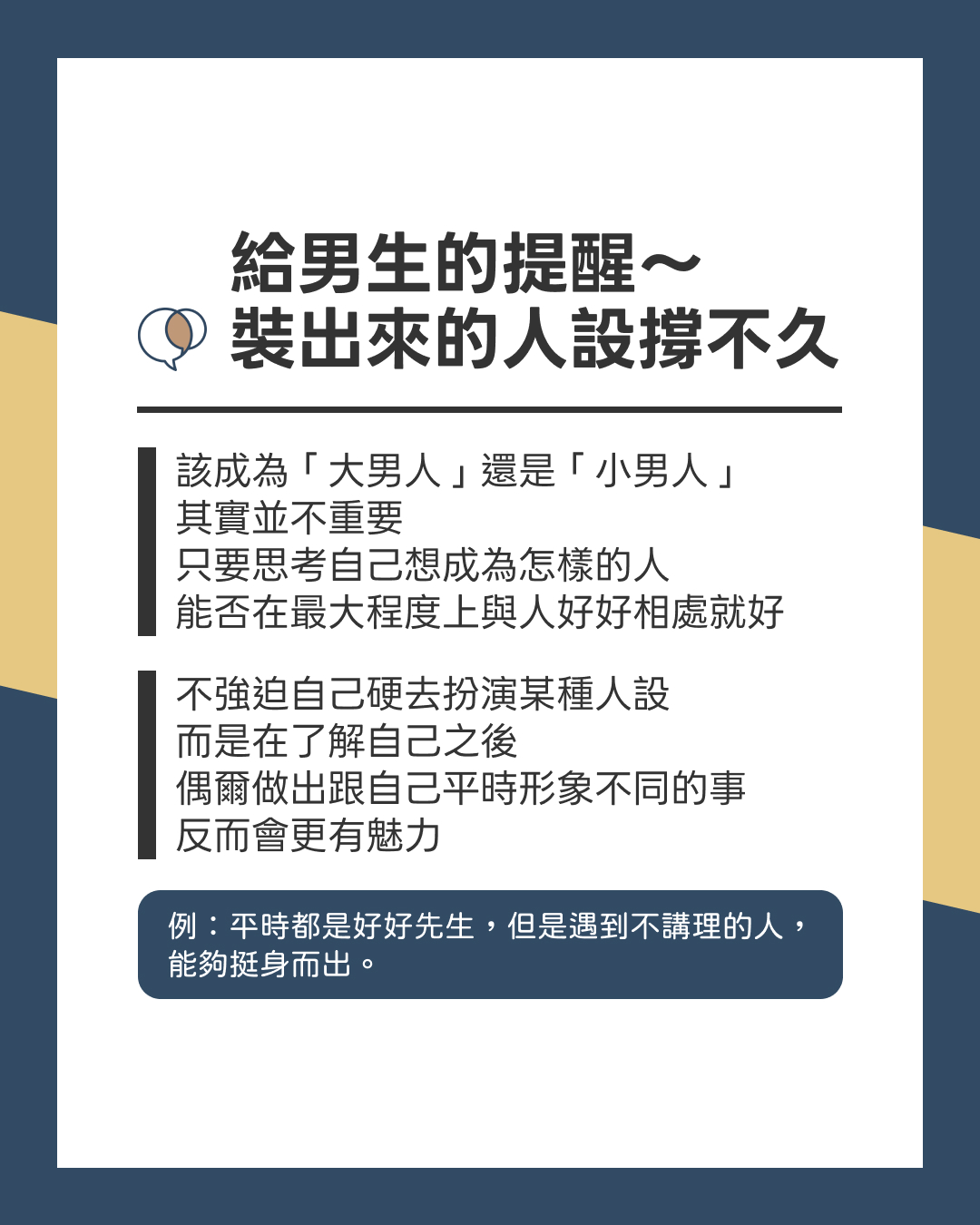 該成為「大男人」還是「小男人」其實並不重要,只要思考自己想成為怎樣的人,能否在最大程度上與人好好相處就好