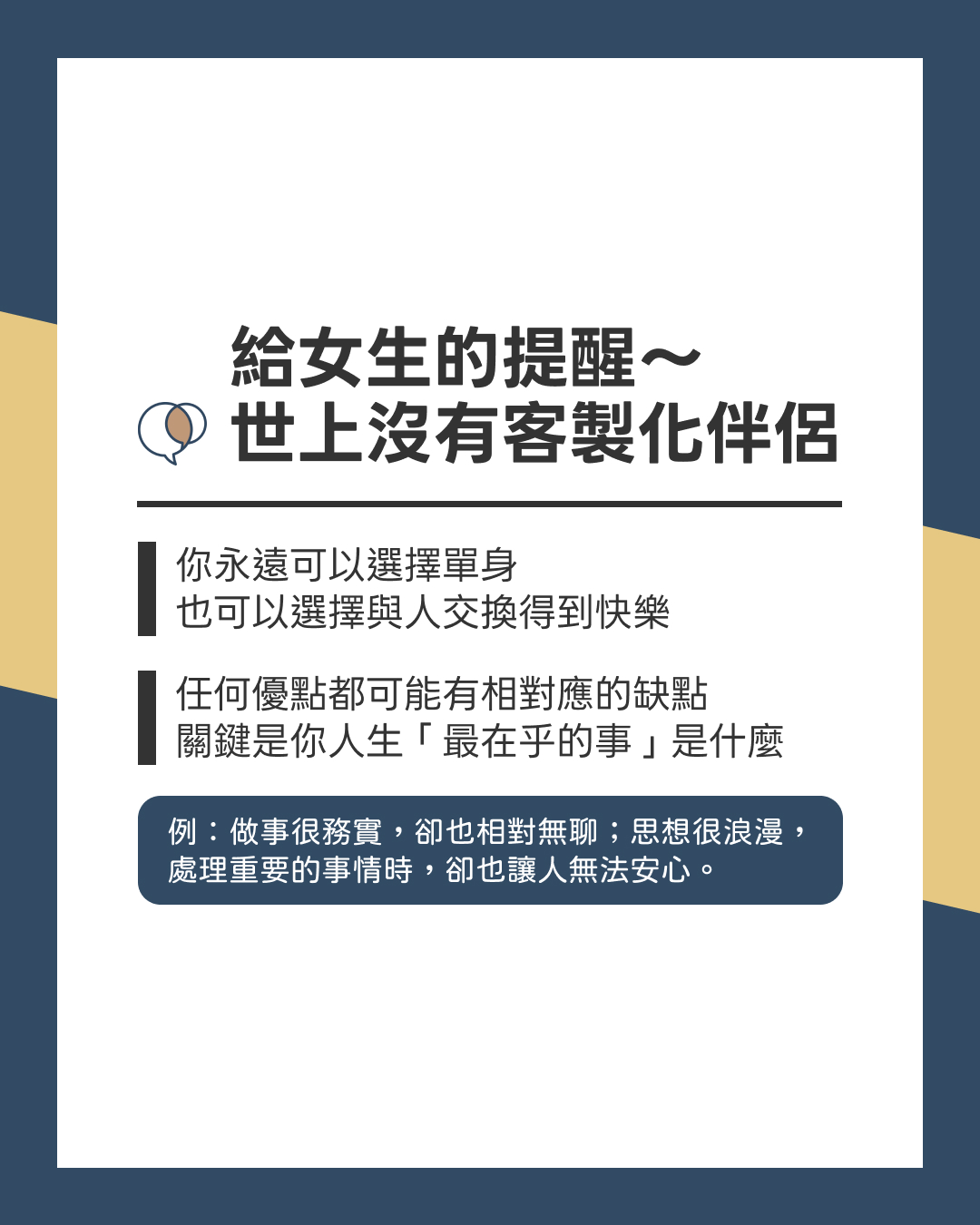 跟自己過日子的人是另一半,如果一直追求伴侶要符合社會期待裡的「理想條件」,會變得像是用另外一個人來映襯自己