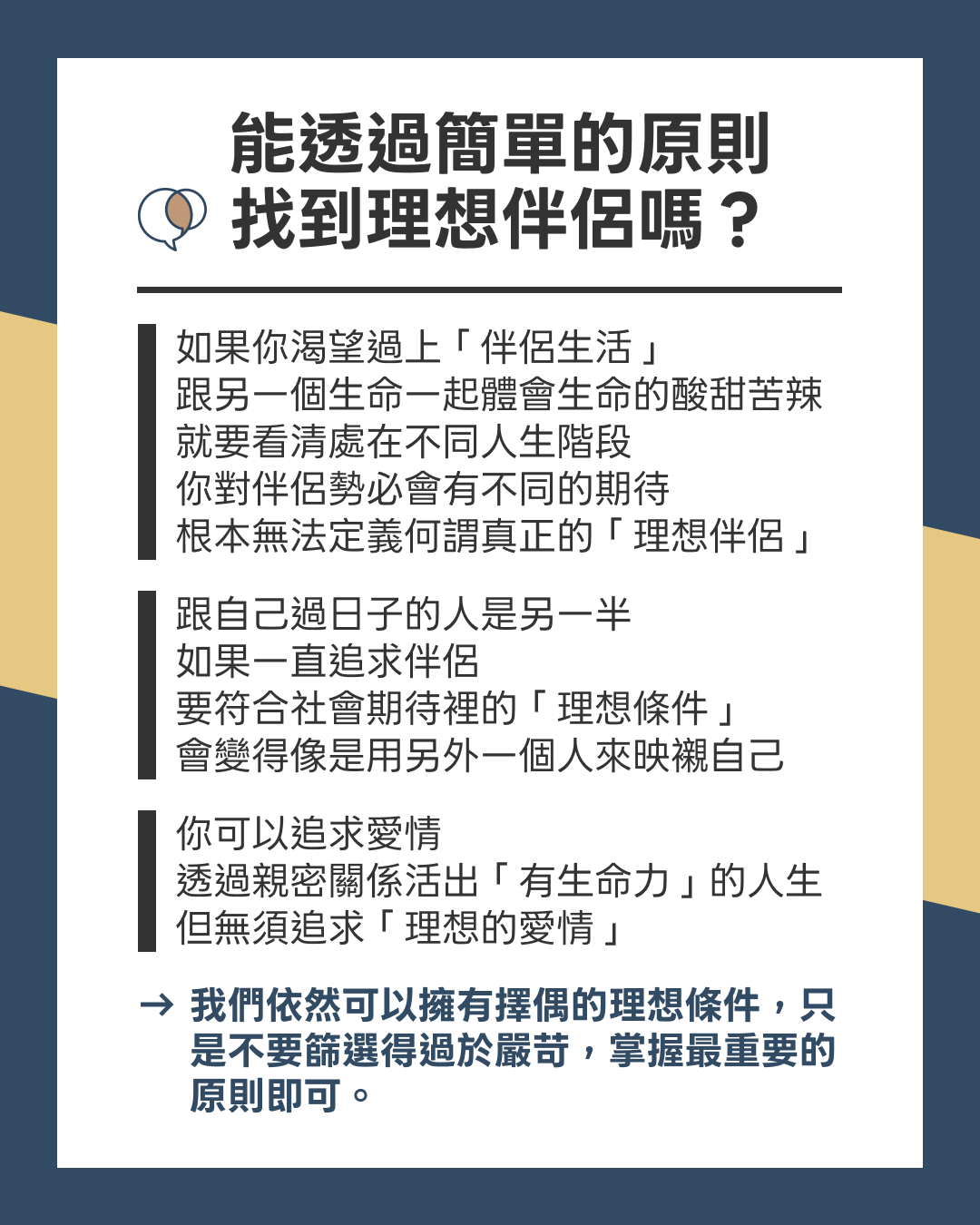 不存在這種原則。如果你渴望過上「伴侶生活」,跟另一個生命一同體會生命中的許多酸甜苦辣,就要看清處在不同人生階段,你對伴侶勢必會有不同的期待,根本無法定義何謂真正的「理想伴侶」