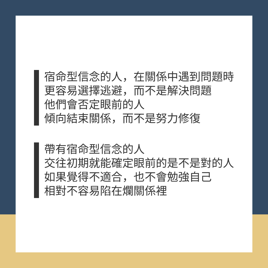 - 帶有宿命型信念的人,在關係中遇到問題時,更容易選擇逃避,而不是解決問題。他們會否定眼前的人,傾向結束關係,而不是努力修復