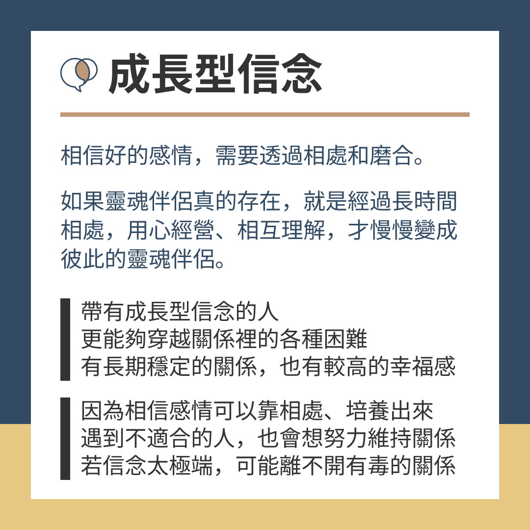 - 成長型信念的人,因為相信感情可以靠相處、培養出來,遇到不適合的對象,也會想努力維持關係,如果信念太極端,可能讓他離不開有毒的關係