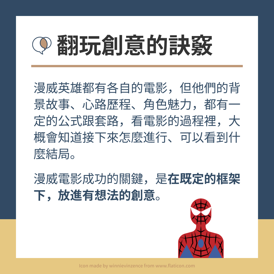 漫威英雄都有各自的電影,但他們的背景故事、心路歷程、角色魅力,都有一定的公式跟套路,看電影的過程裡,大概會知道接下來怎麼進行、可以看到什麼結局。所以漫威電影成功的關鍵,是在既定的框架下,放進有想法的創意。
