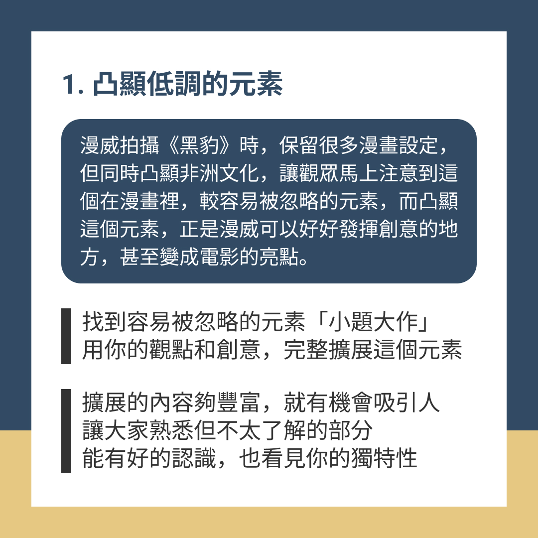 漫威拍攝《黑豹》時,保留很多漫畫設定,但同時凸顯非洲文化,讓觀眾馬上注意到這個在漫畫裡,較容易被忽略的元素,而凸顯這個元素,正是漫威可以好好發揮創意的地方,甚至變成電影的亮點。