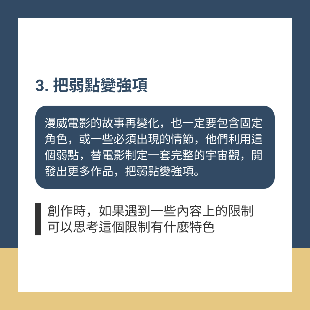 漫威電影的故事再變化,也一定要包含固定角色,或一些必須出現的情節,他們利用這個弱點,替電影制定一套完整的「宇宙觀」,開發出更多作品,把弱點變強項。
