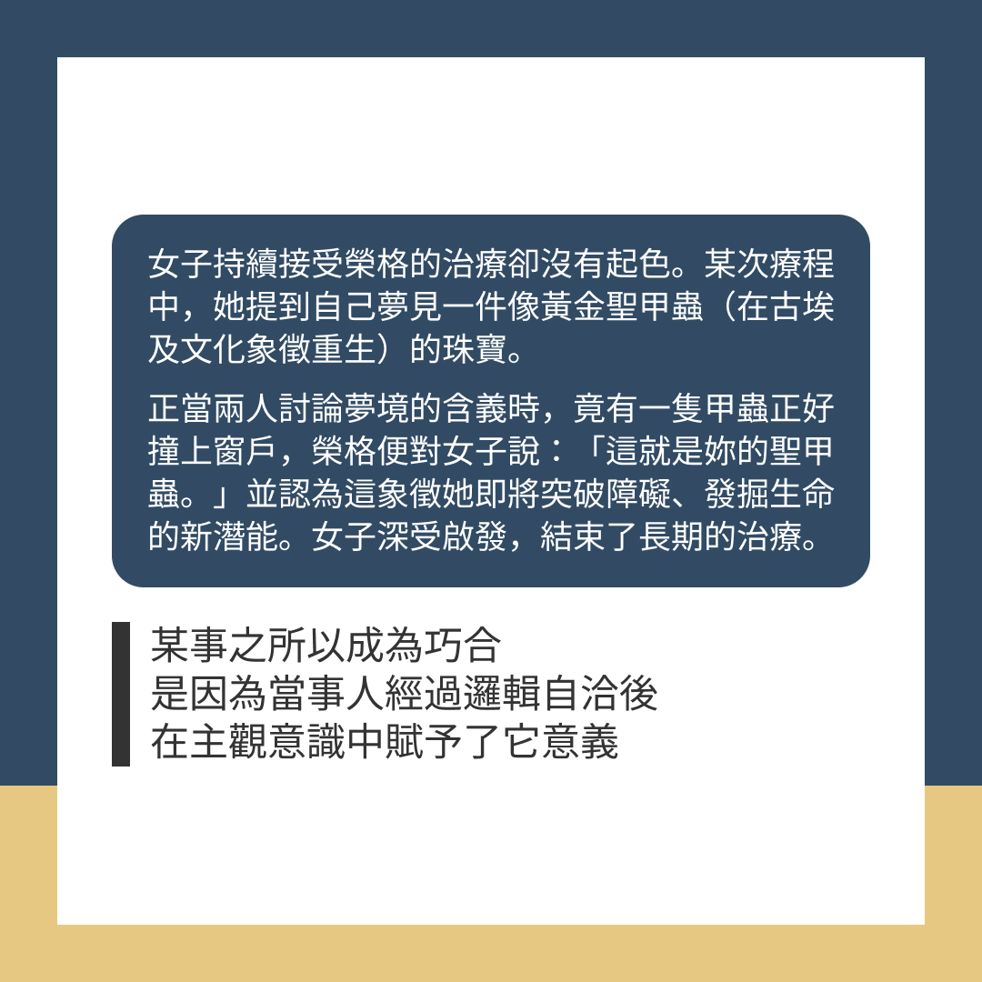 一位年輕女子持續接受榮格治療,卻沒有起色。某次療程中,她提到自己夢見一件像黃金聖甲蟲(在古埃及文化象徵重生)的珠寶。正當兩人討論夢境的含義時,竟有一隻甲蟲正好撞上窗戶。榮格便對女子說:「這就是妳的聖甲蟲。」並認為這象徵她即將突破障礙,發掘生命的新潛能。女子深受啟發,並結束了長期的治療。