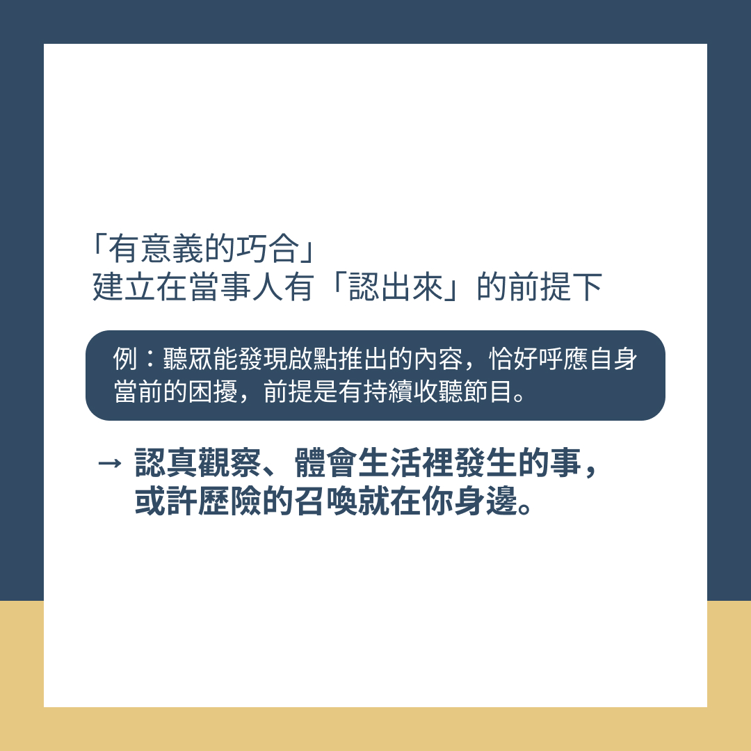 例:聽眾能發現啟點推出的內容,恰好呼應自身當前的困擾的前提,是有持續在收聽節目。