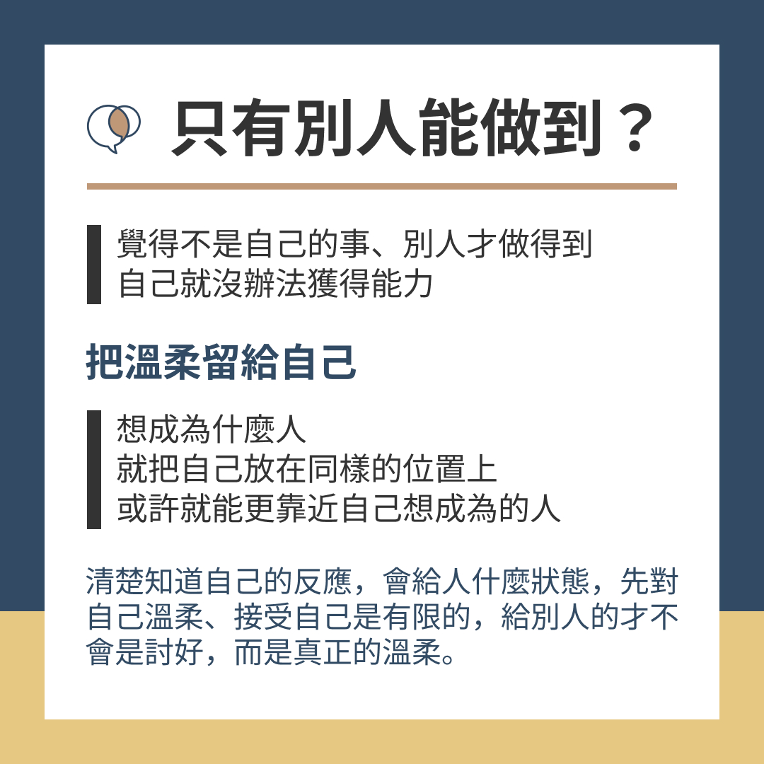 清楚知道自己的反應,會給人什麼狀態,先對自己溫柔、接受自己是有限的,給別人的才不會是討好,而是真正的溫柔