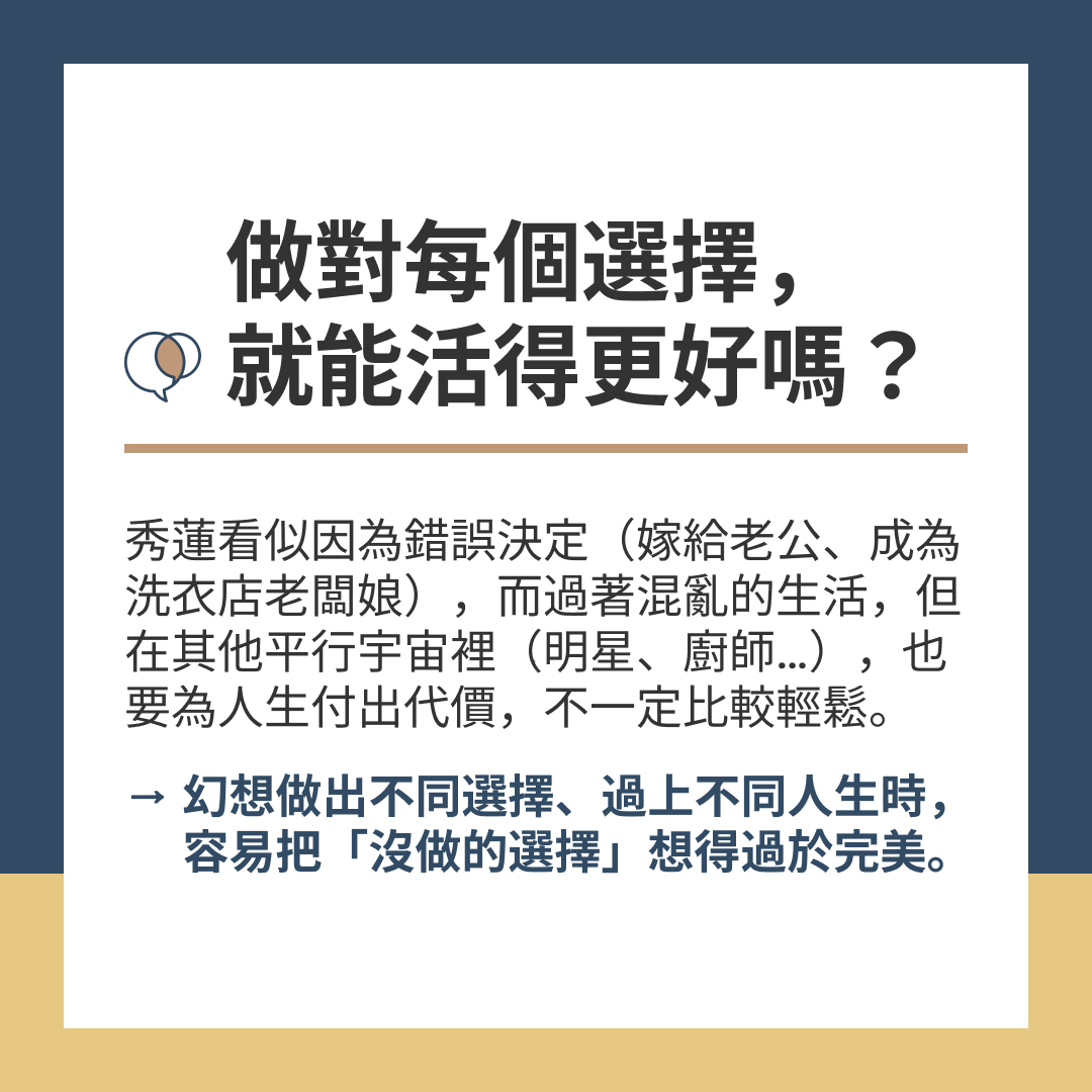 秀蓮看似因為錯誤決定(嫁給老公、成為洗衣店老闆娘),而過著混亂的生活,但是在其他平行宇宙裡(成為明星、廚師…),也要為人生付出代價,不一定比較輕鬆