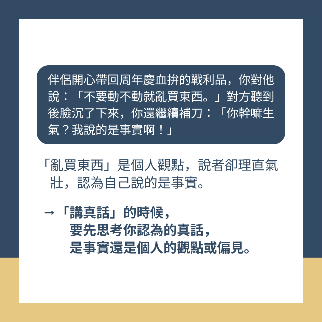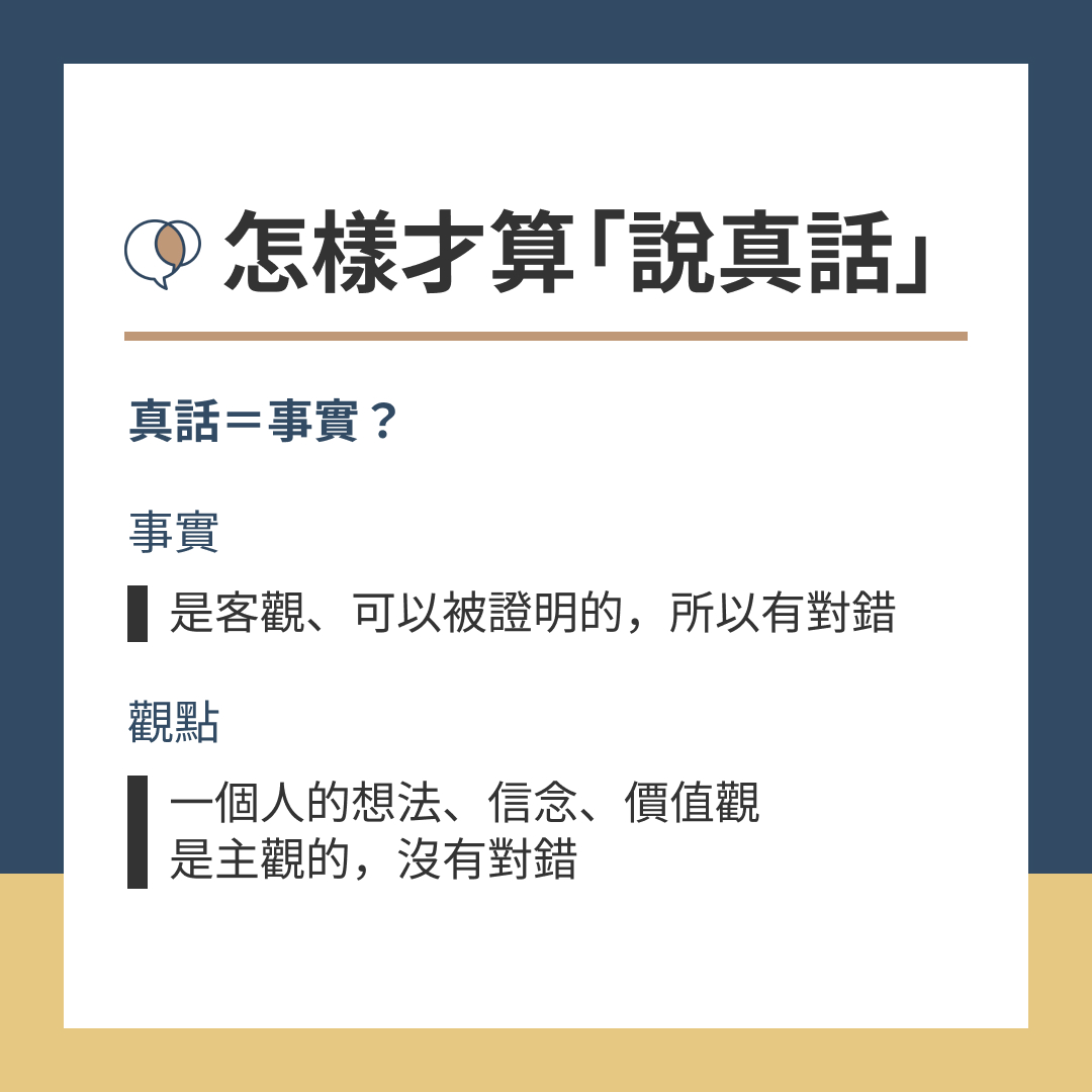 → 「講真話」的時候,先思考你認為的真話是事實,還是個人的觀點或偏見。