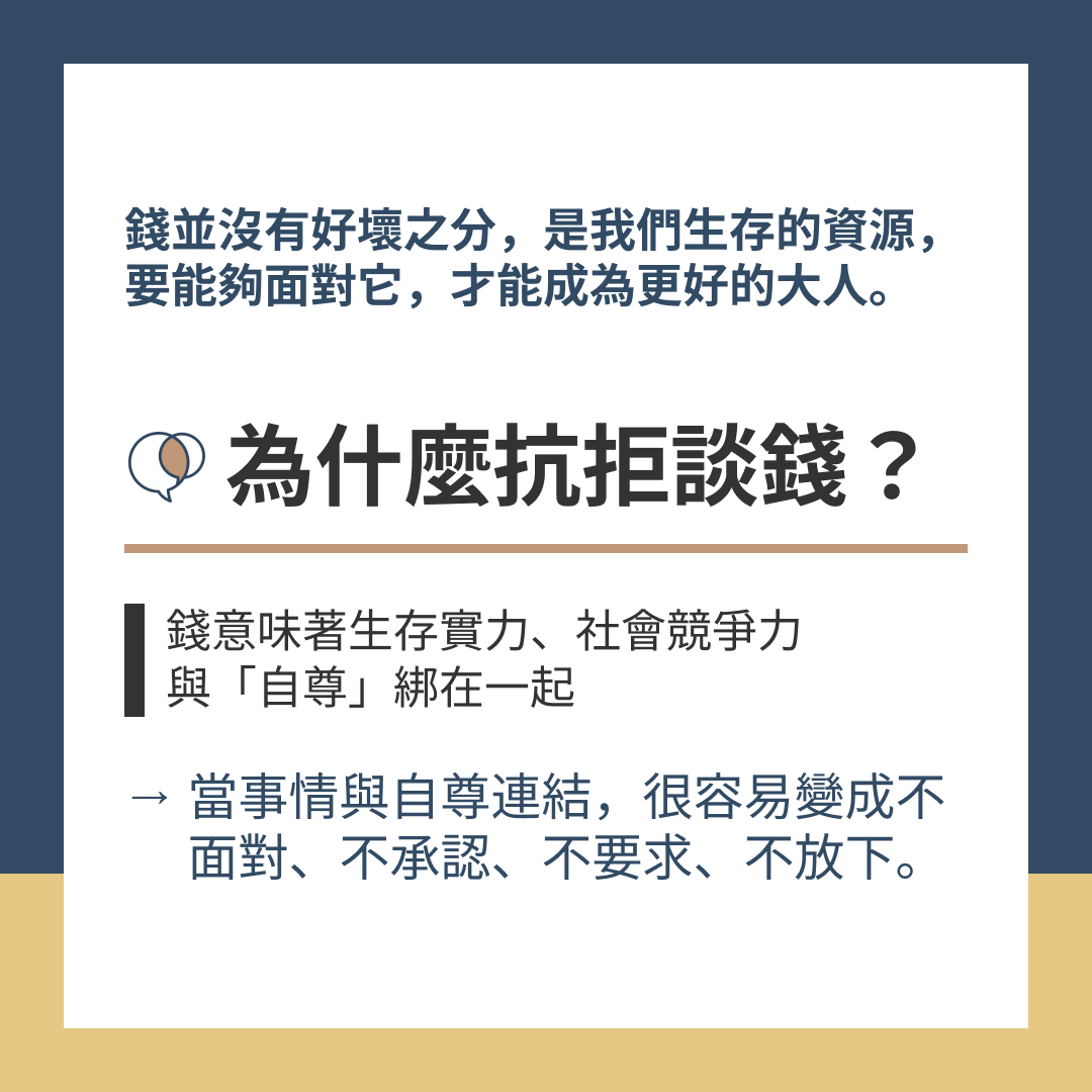 - 錢意味著生存實力、社會競爭力,與「自尊」綁在一起