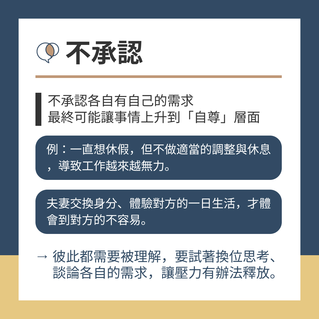 - 不承認各自有自己的需求,最終可能讓事情上升到「自尊」層面