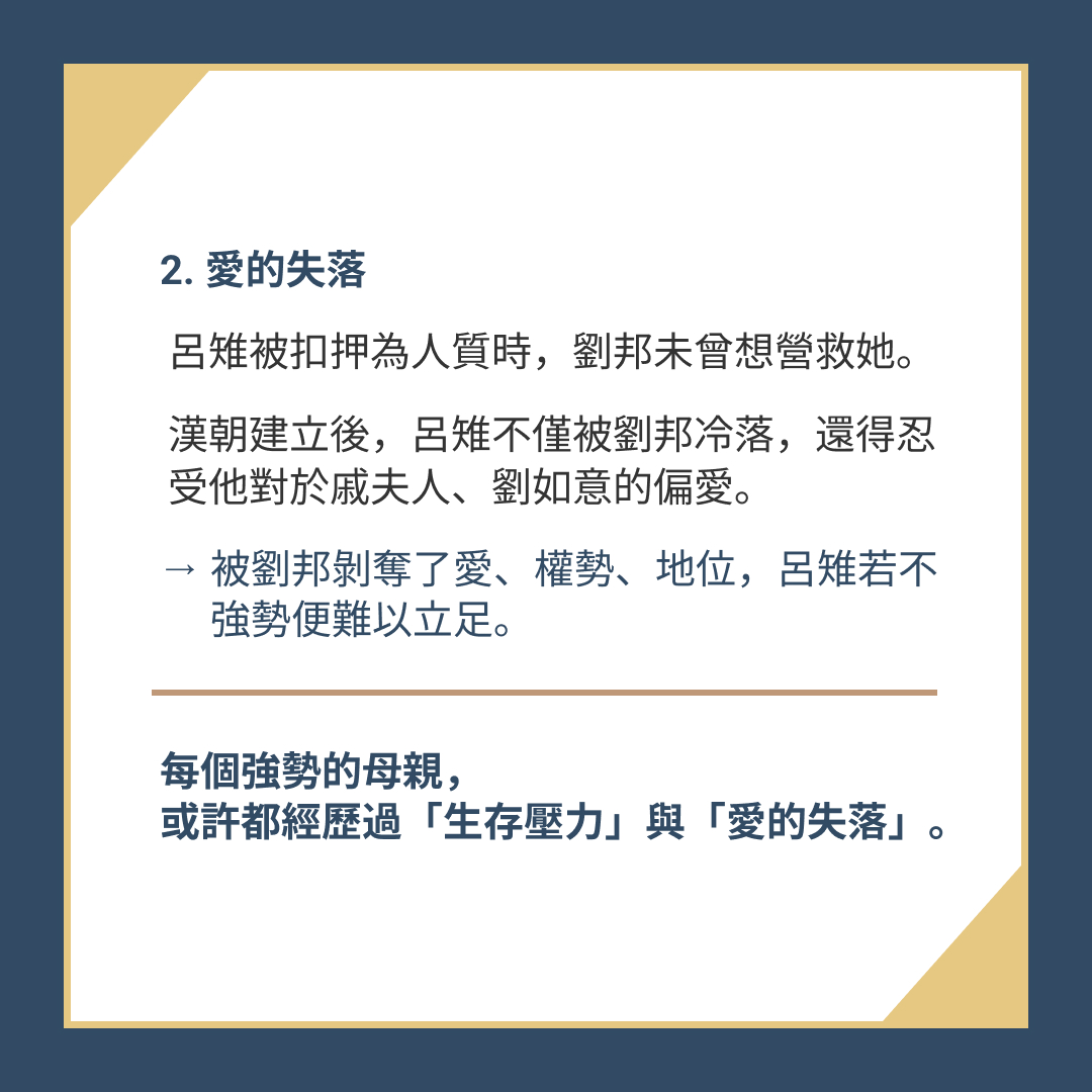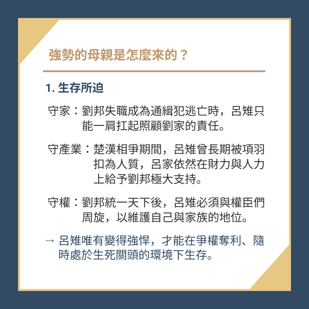 → 被劉邦剝奪了愛、權勢與地位,呂雉若不強勢便難以立足。