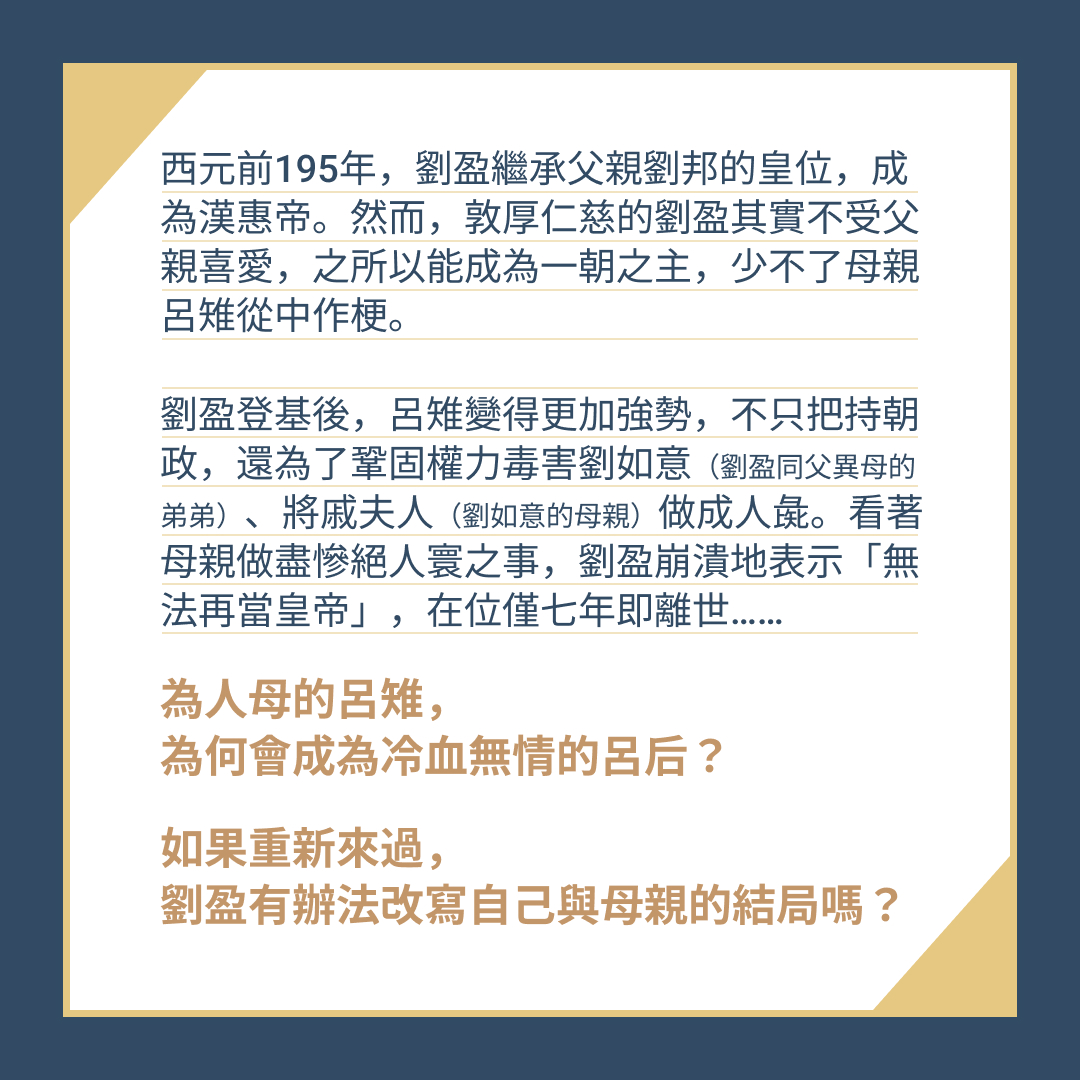 當初劉盈如果透過不停安撫,來軟化強勢的母親,他們之間的心理界限將變得模糊,劉盈依然無法活出自己的人生。