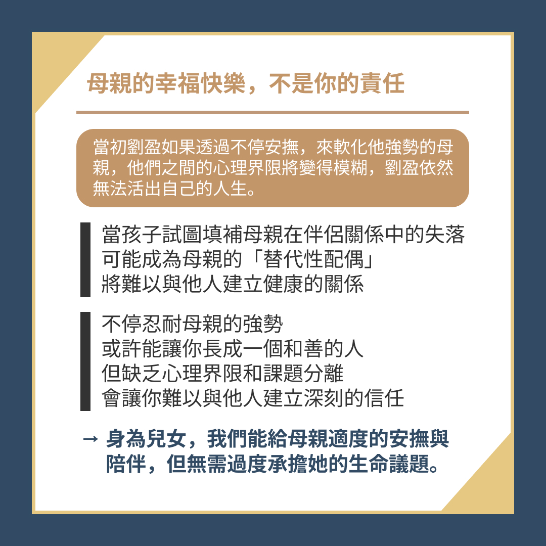 → 身為兒女,我們能給予母親適度的安撫、陪伴,但無需過度承擔她的生命議題。