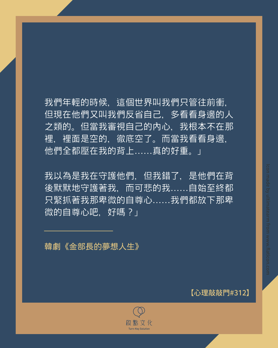 為何傳統形象裡的父親,總是嚴肅、重事業又不善表達情緒,且在中年遇上挫折之後,容易變得一蹶不振?原來好強、愛面子的大男人,背後可能藏著一個渴望被認同的男孩 在《心理敲敲門#312》中,節目以韓劇 金部長的夢想人生 為核心素材,深入探討中年男性在社會成就、男性自尊與真實自我之間的拉扯。劇中的金部長,原本擁有體制認可的「成功人生」,卻在職場失勢、家庭角色動搖後,陷入強烈的中年恐慌與比較焦慮。本集透過劇情解析指出,許多男性長期以社會地位、他人認可來支撐自我價值,一旦這些外在指標崩解,內在的空洞便全面浮現。節目也描繪金部長如何在家人、手足與自身挫敗中,逐步放下「理想自我」,學習接住愛、承認有限,最終活出「真心想活」的人生樣貌,為正在經歷中年迷惘、職涯焦慮與自我懷疑的聽眾,提供深刻的心理對照與反思。