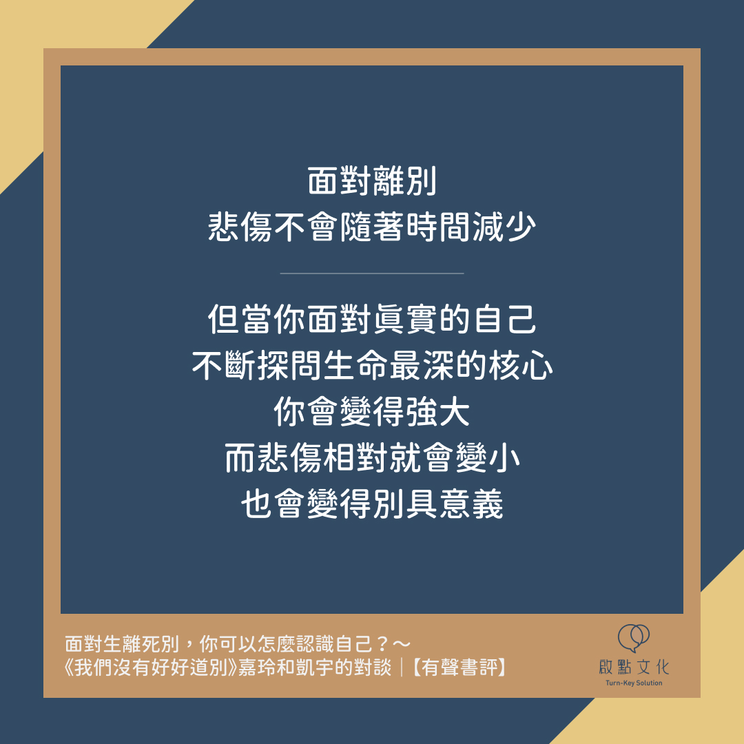面對離別,悲傷不會隨著時間減少,但當你面對真實的自己、不斷探問生命最深的核心,你會變得強大,而悲傷相對就會變小,也會變得別具意義。