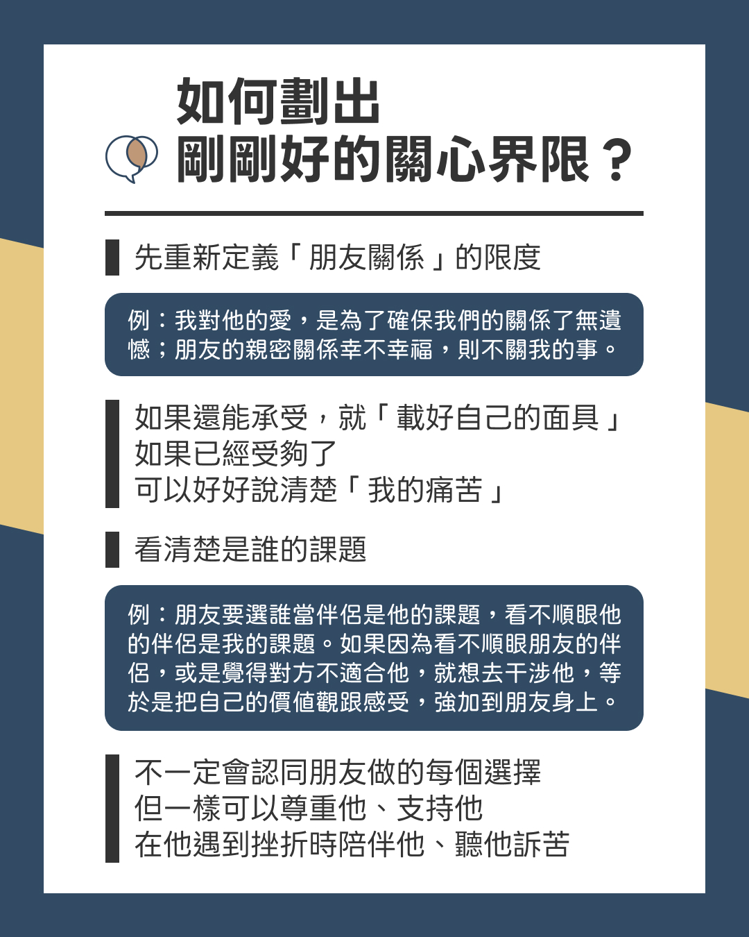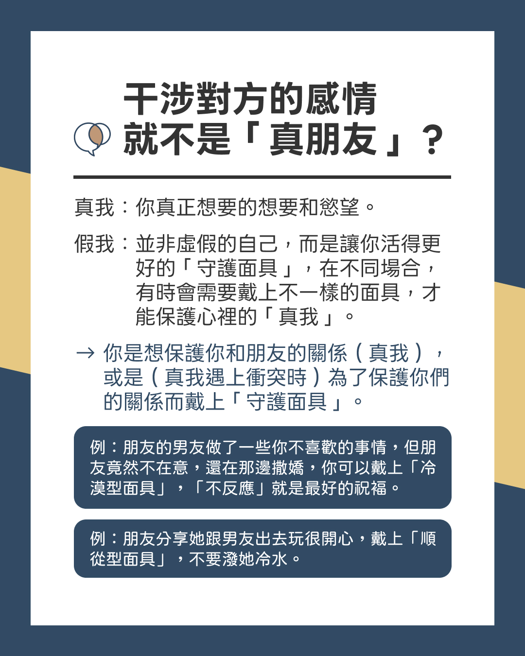 → 釐清自己想要保護的,是你和朋友的關係(真我),或是為了保護你們的關係(真我遇上衝突時),才戴上「守護面具」。