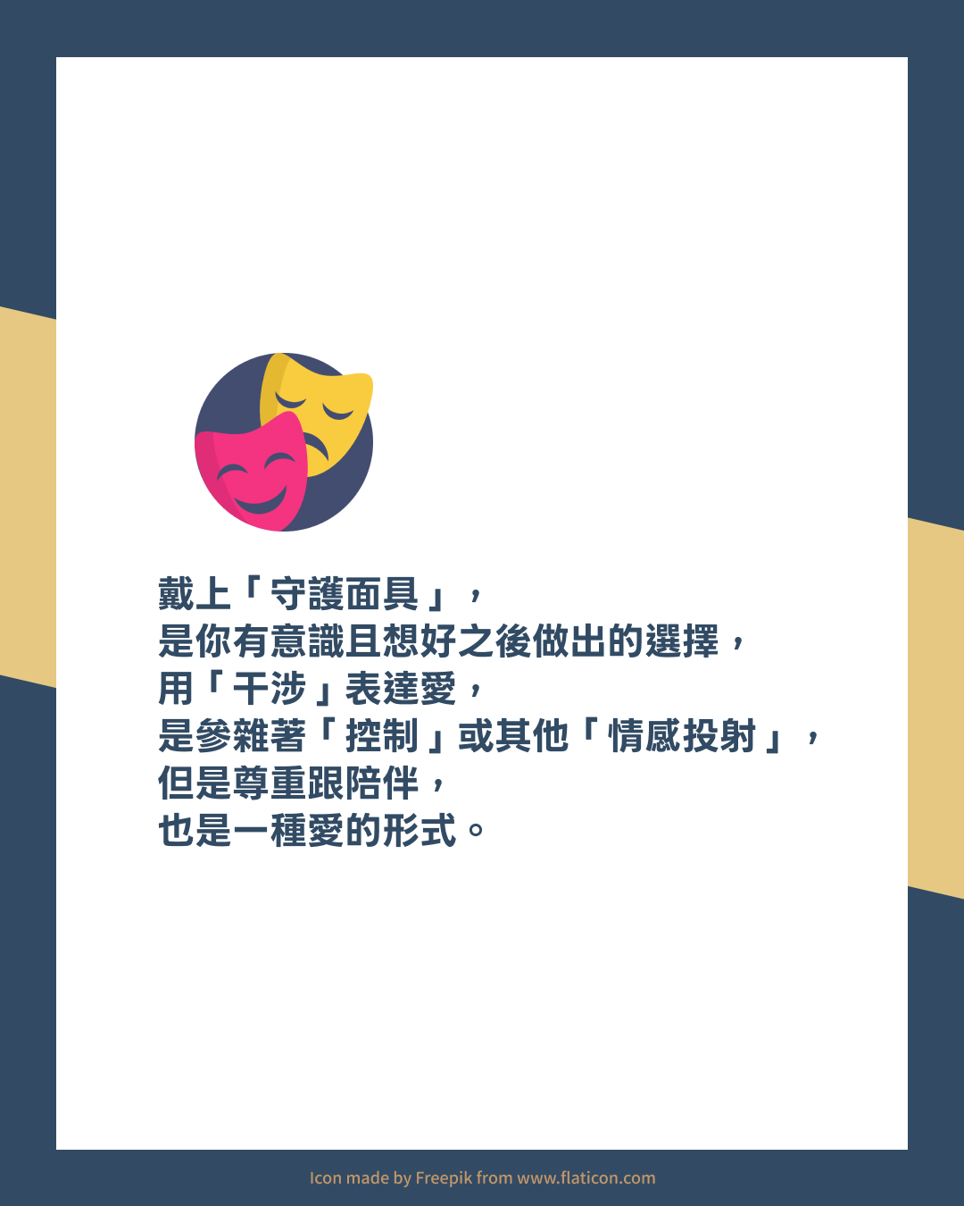※ 假我:並非虛假的自己,而是用來讓你活得更好的「守護面具」,在不同的場合,有時會需要戴上不一樣的面具,才能保護心裡的「真我」。