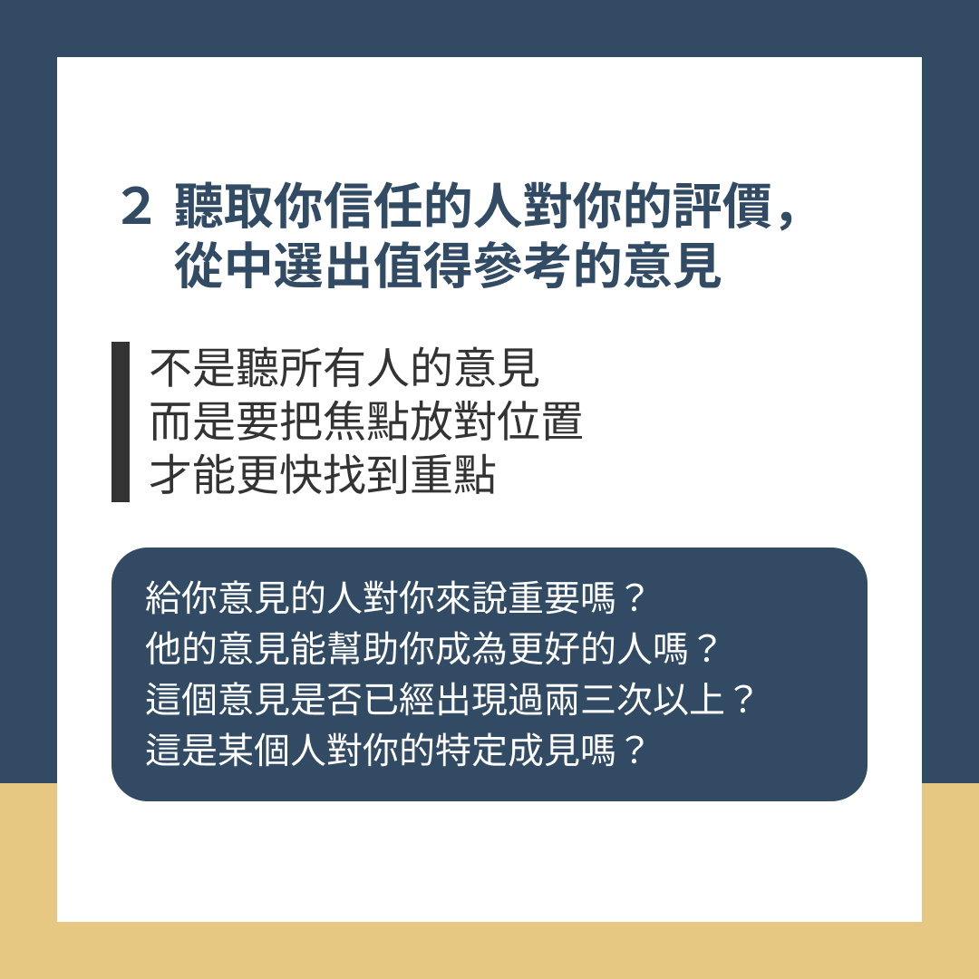 問自己:給意見的人對你來說重要嗎?他的意見能幫助你成為更好的人嗎?這個意見是否已經出現過兩三次以上?這是某個人對你的特定成見嗎?